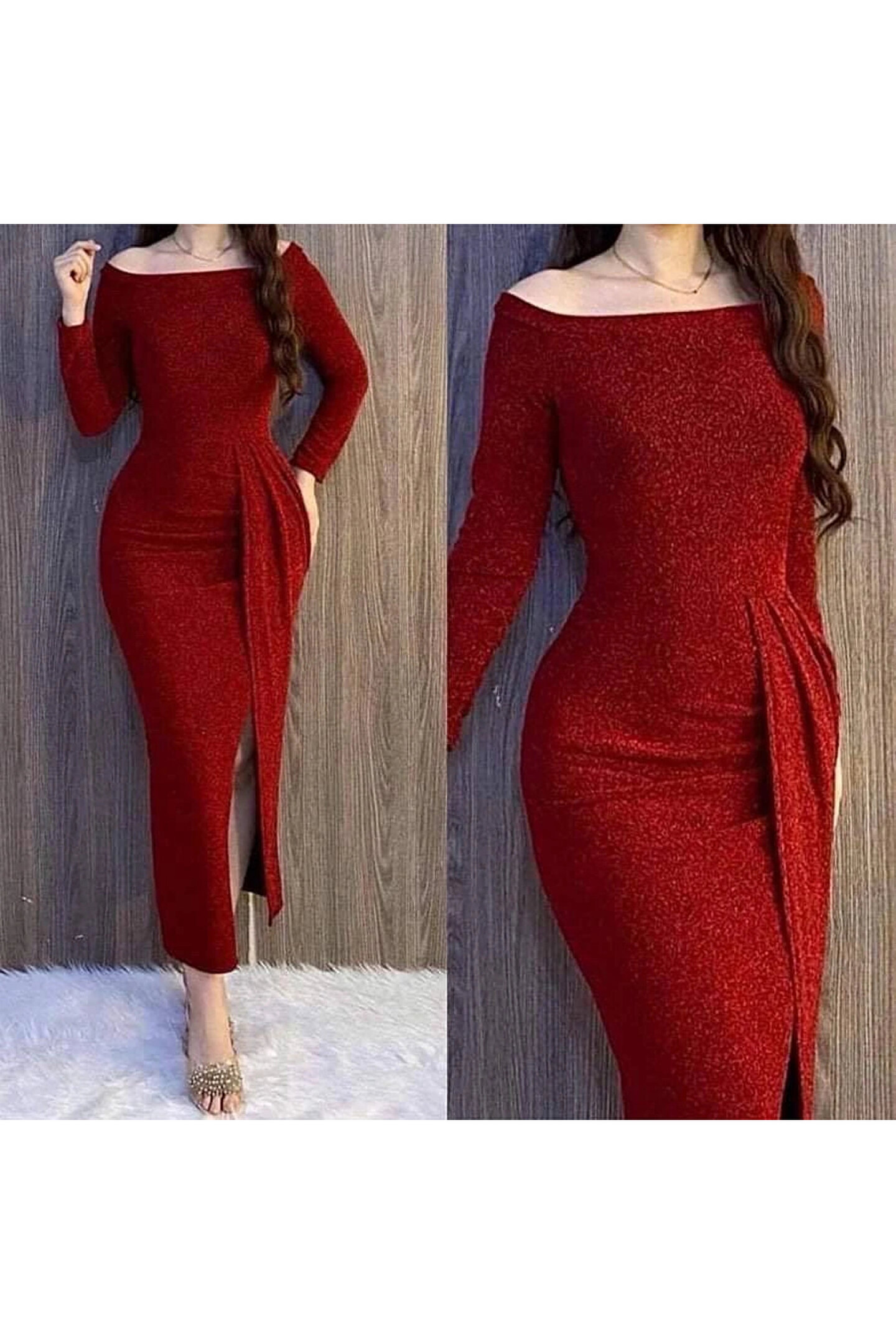 Kadın Uzun Kollu Kayık Yaka Büzgü Ve Maxi Boy Yırtmaç Detay Simli Kadife Kumaş Elbise
