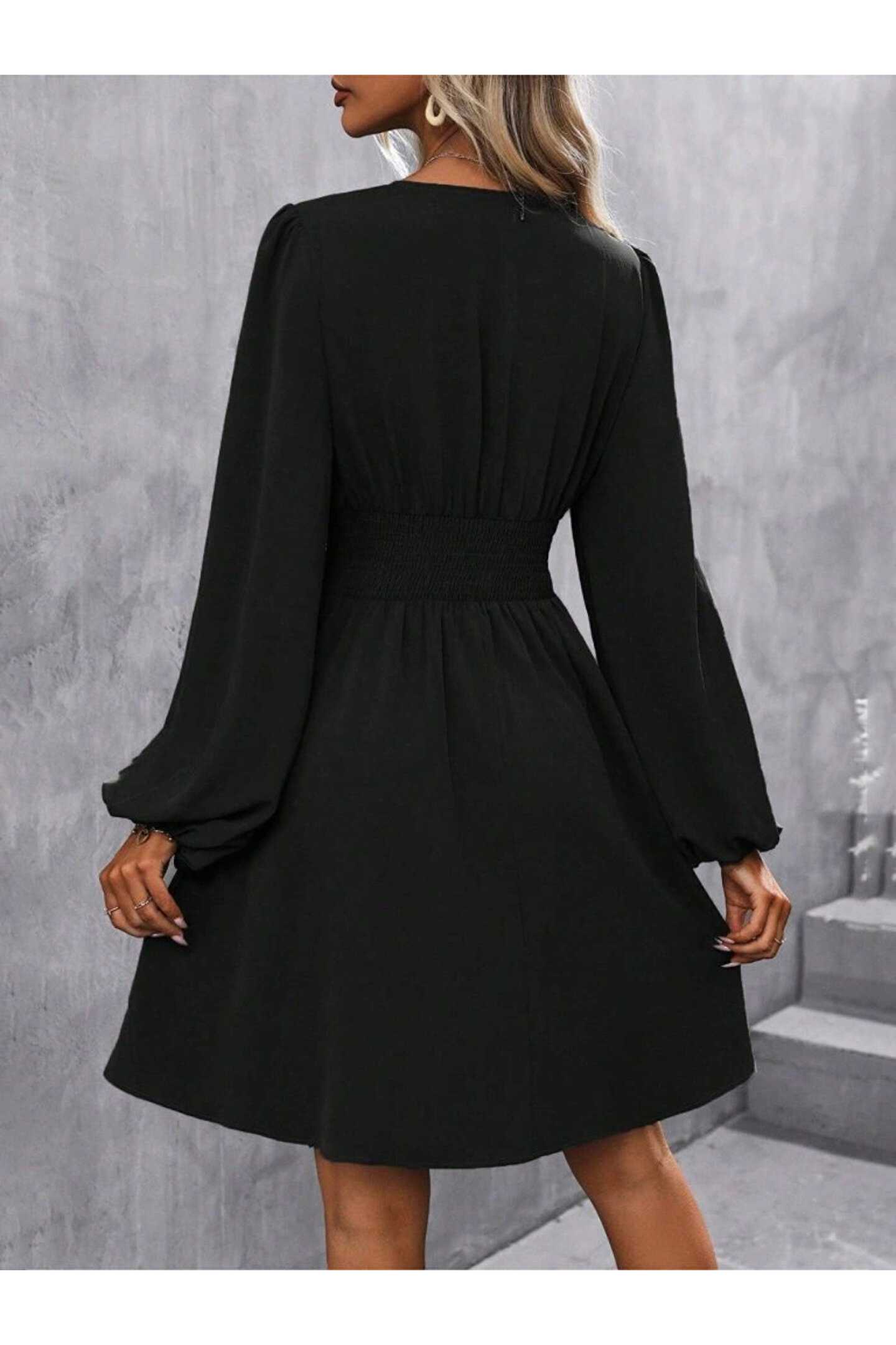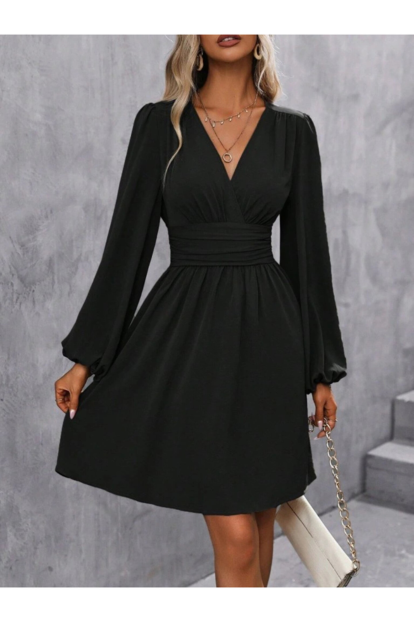 Kadın Uzun Kollu Kruvaze Yakalı Bel Korsajlı Mini Elbise