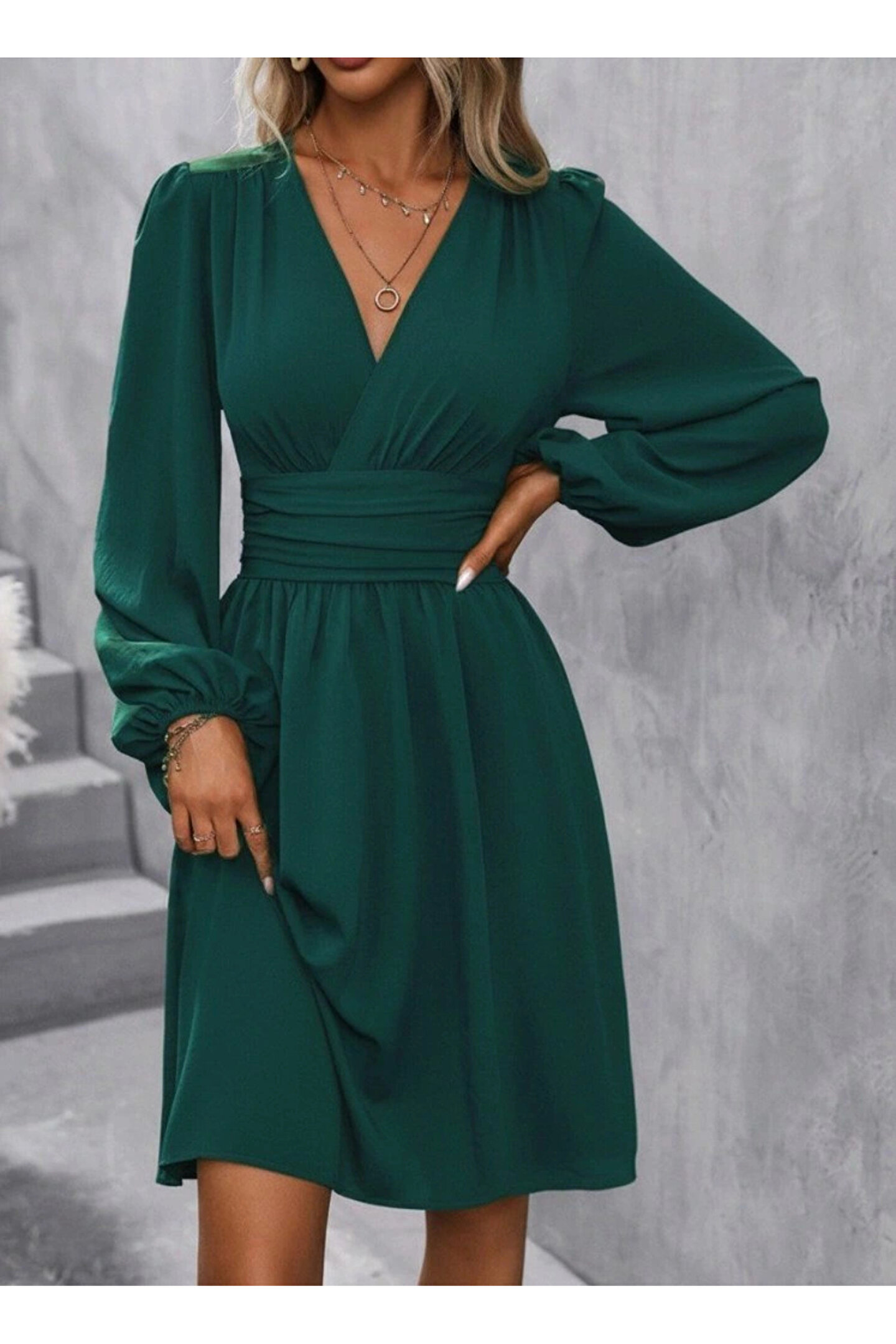 Kadın Uzun Kollu Kruvaze Yakalı Bel Korsajlı Mini Elbise