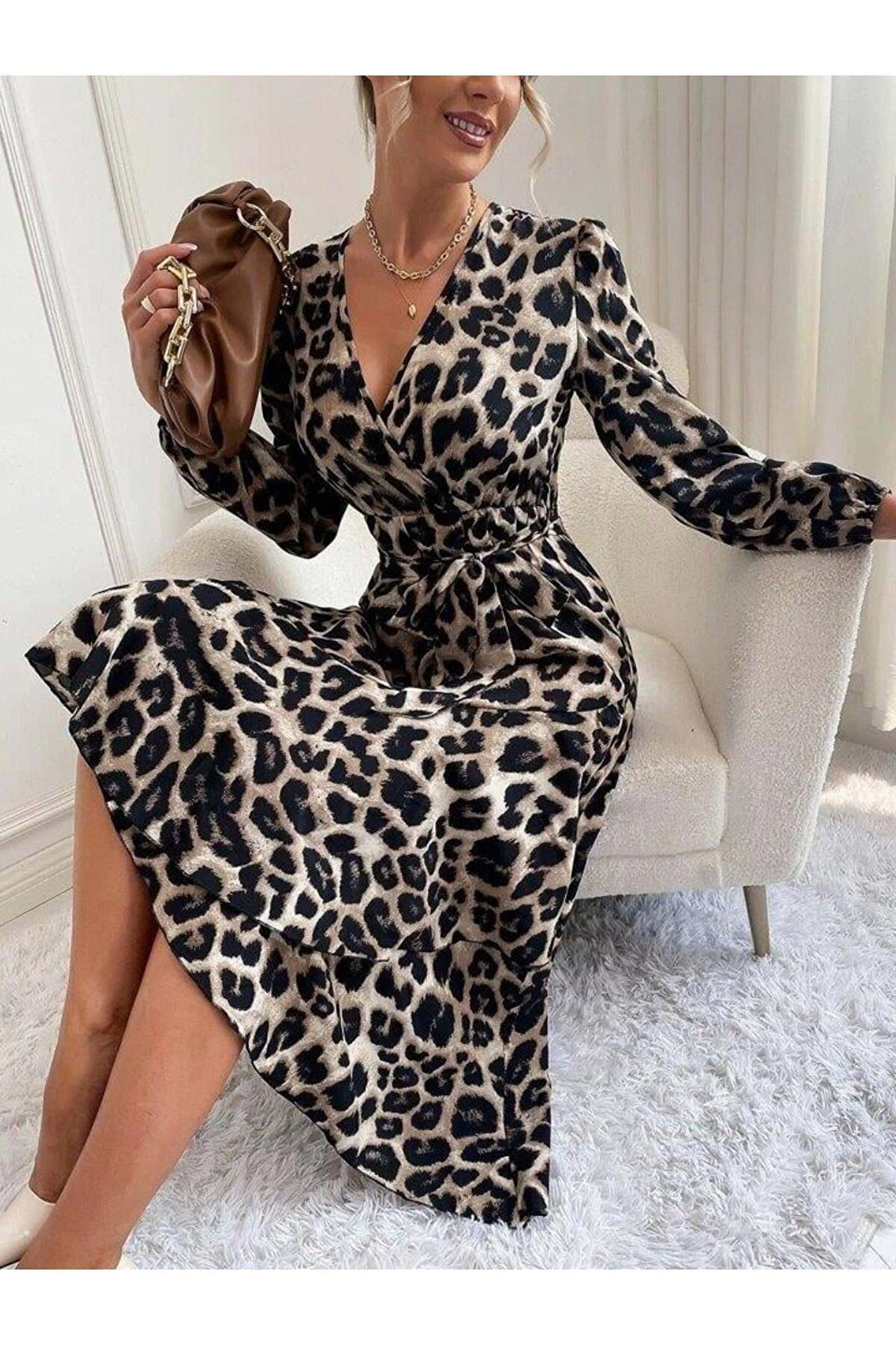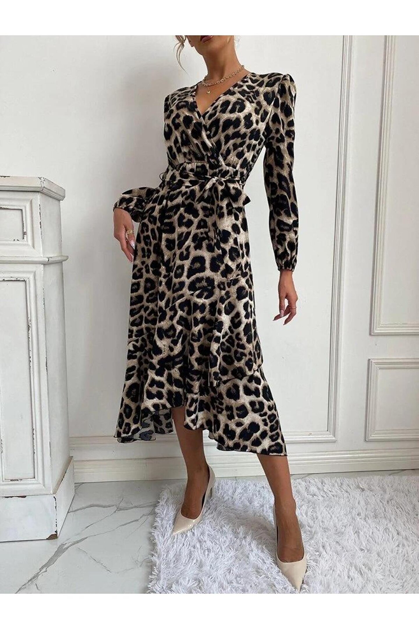Kadın Uzun Kollu Kruvaze Yakalı Belden Kuşaklı Leopar