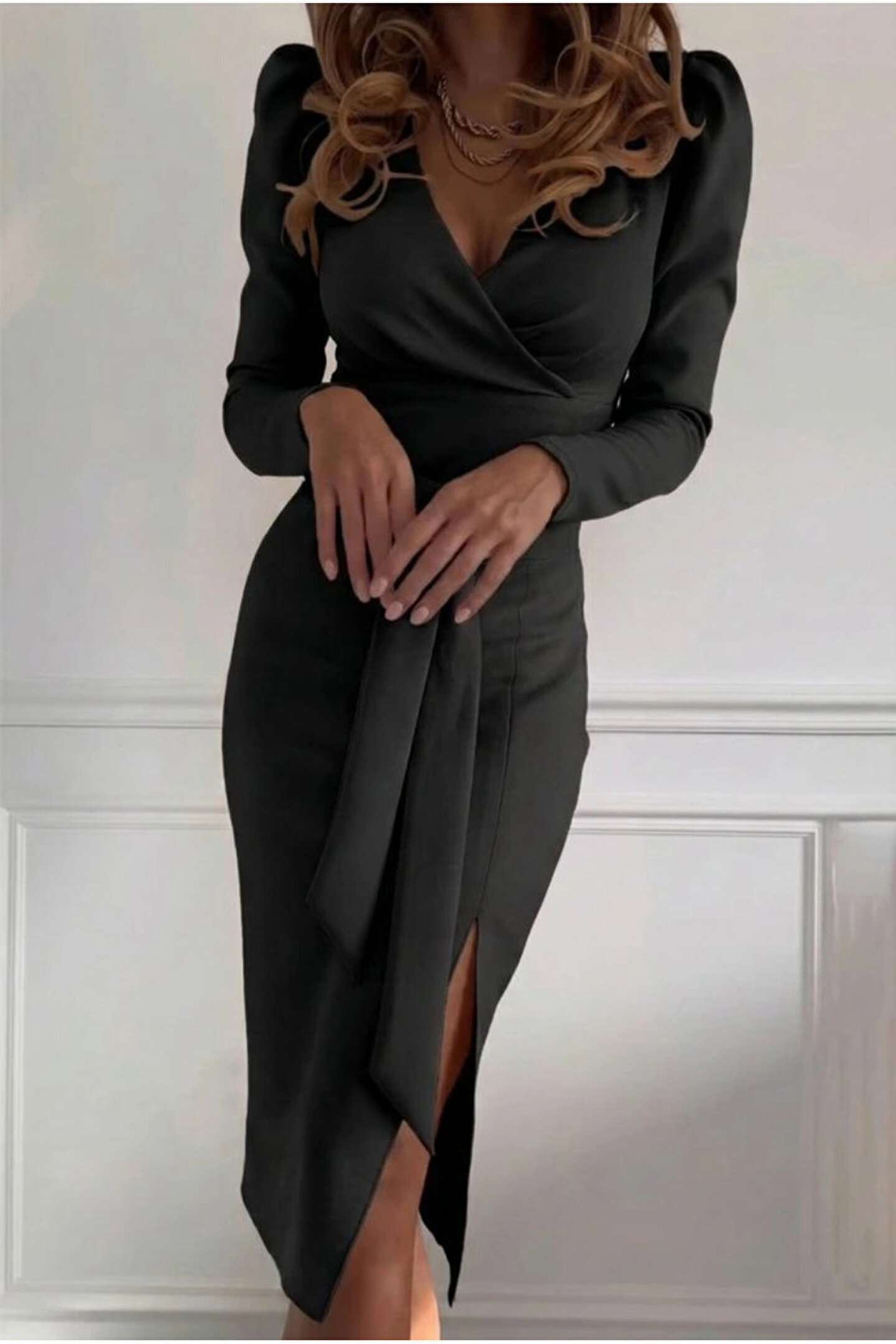 Kadın Uzun Kollu Kruvaze Yakalı Yandan Yırtmaçlı Belden Kuşaklı Midi Ithal Krep Elbise