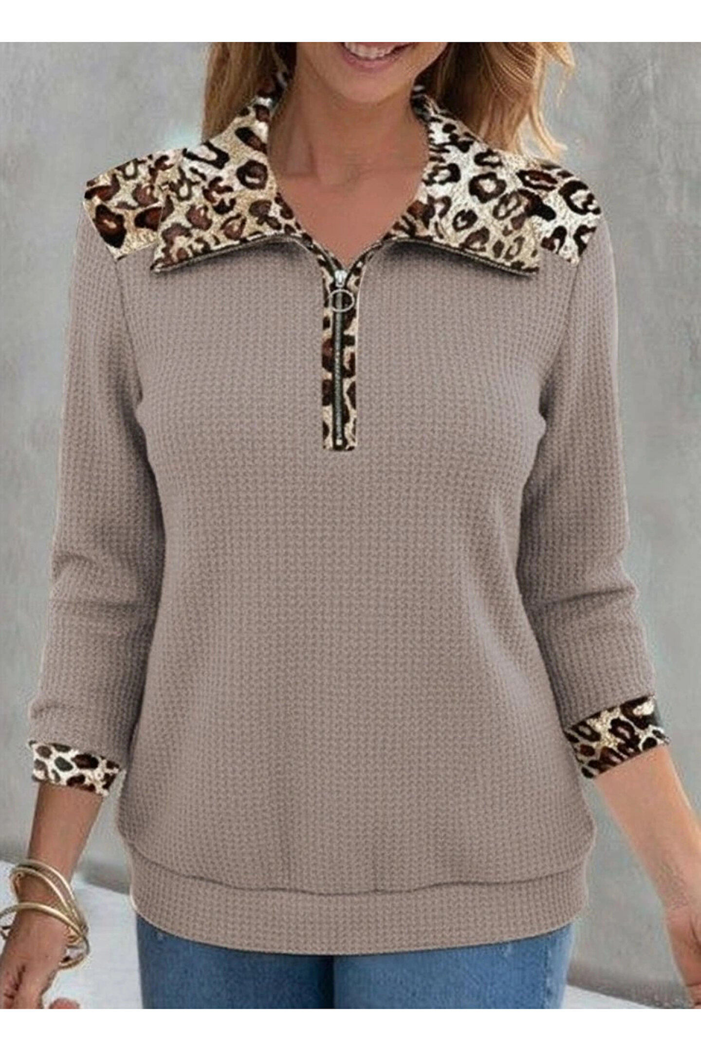 Kadın Uzun Kollu Leopar Yakalı Fermuarlı Waffle Bluz