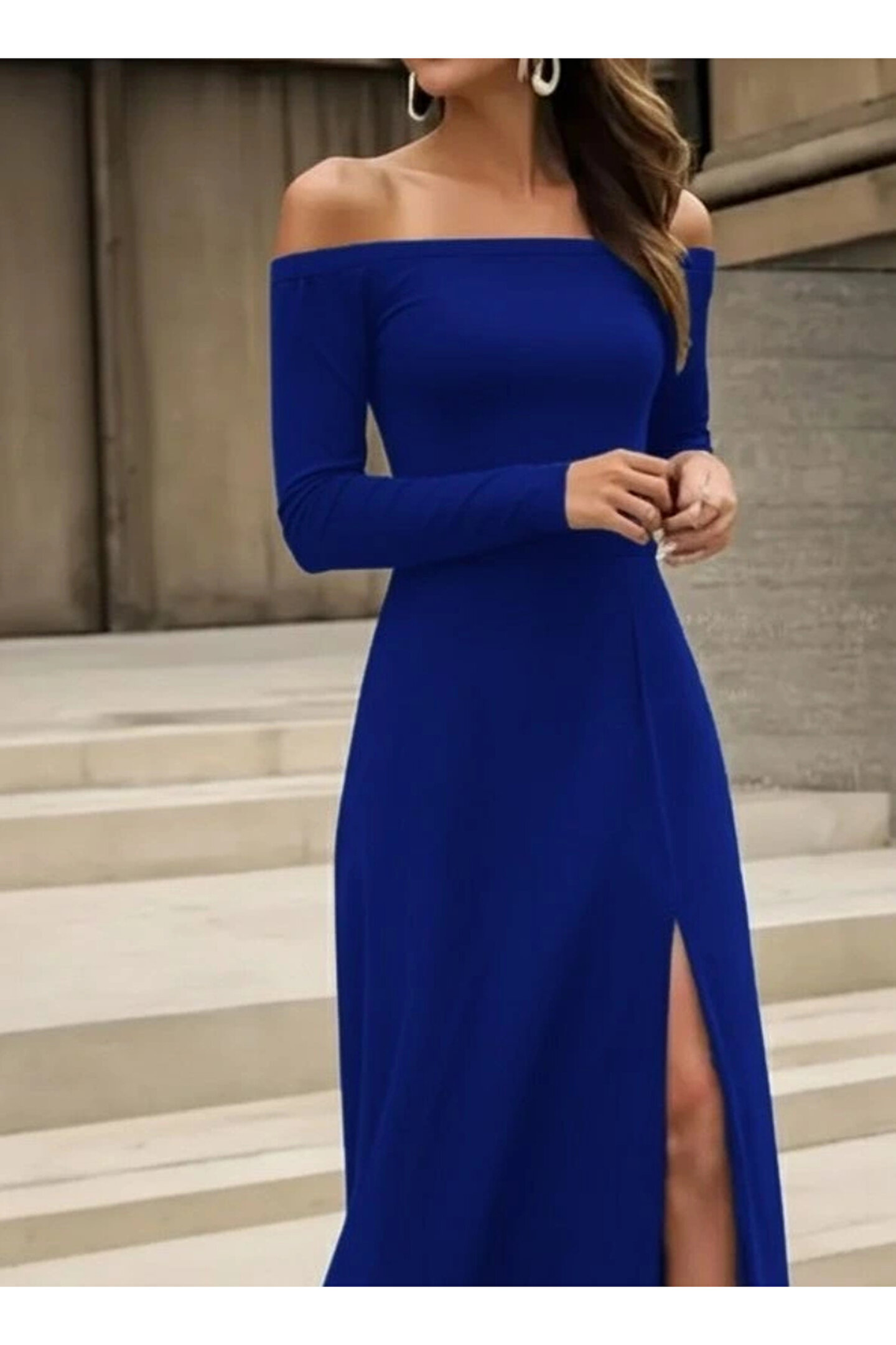 Kadın Uzun Kollu Madonna Yakalı Yırtmaç Detaylı Uzun Ithal Krep Elbise
