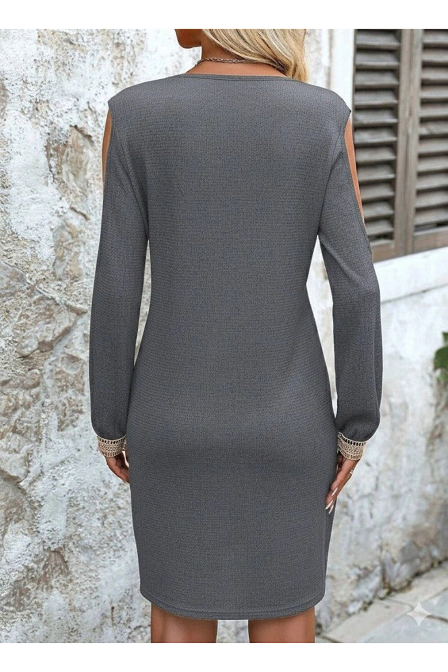 Kadın Uzun Kollu Omuzdan Açık V Dantel Yakalı Mini Waffle Elbise