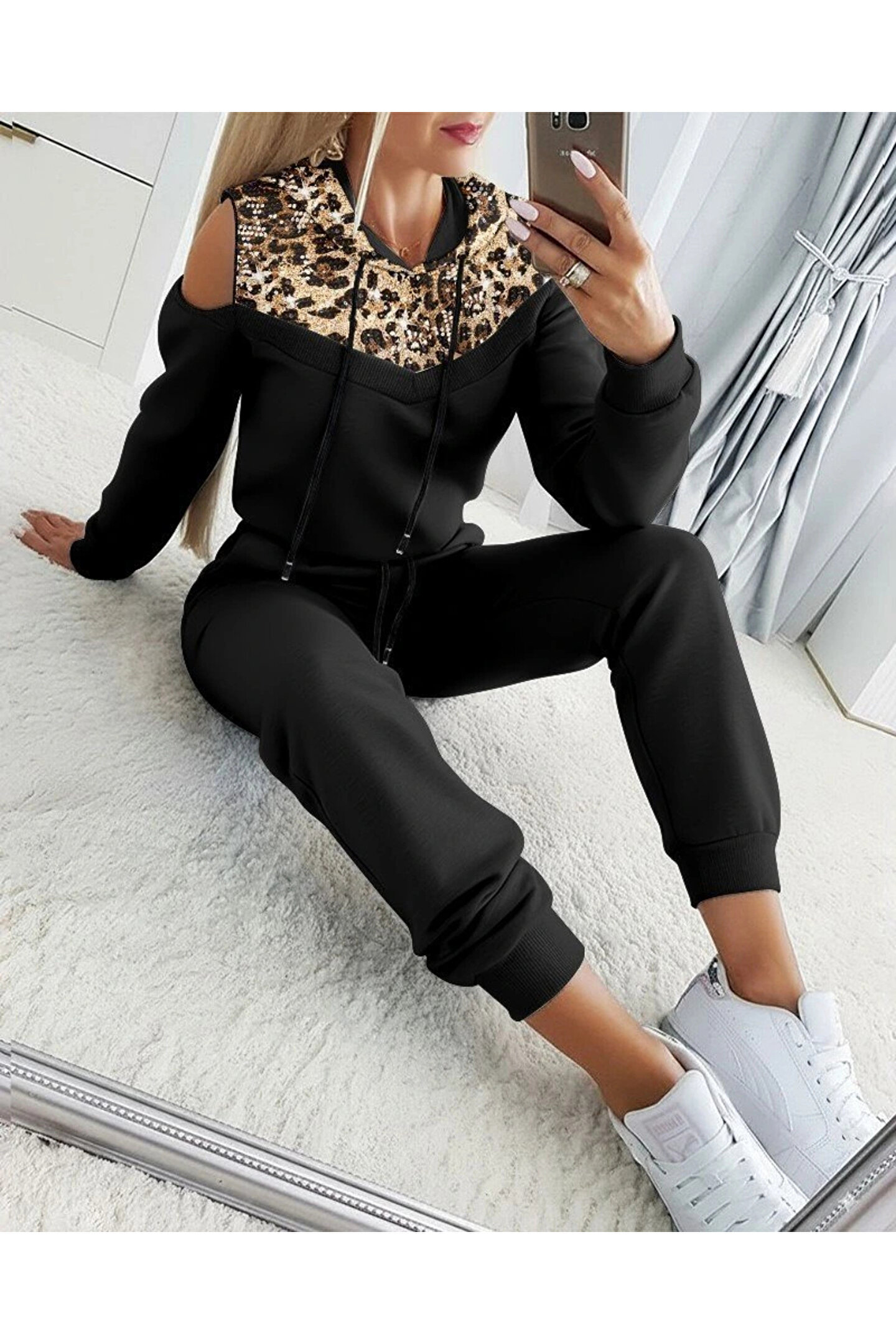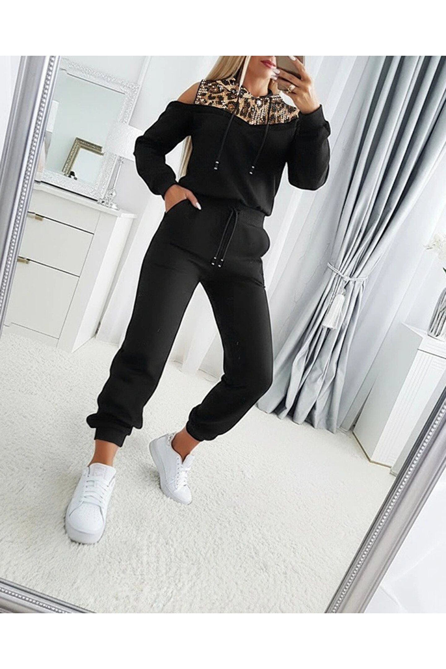 Silerra Kadın Uzun Kollu Omuzlardan Açık Leopar Desenli Kapşonlu Viskon Iki Iplik Bluz Ve Pantolon Ikili Tak