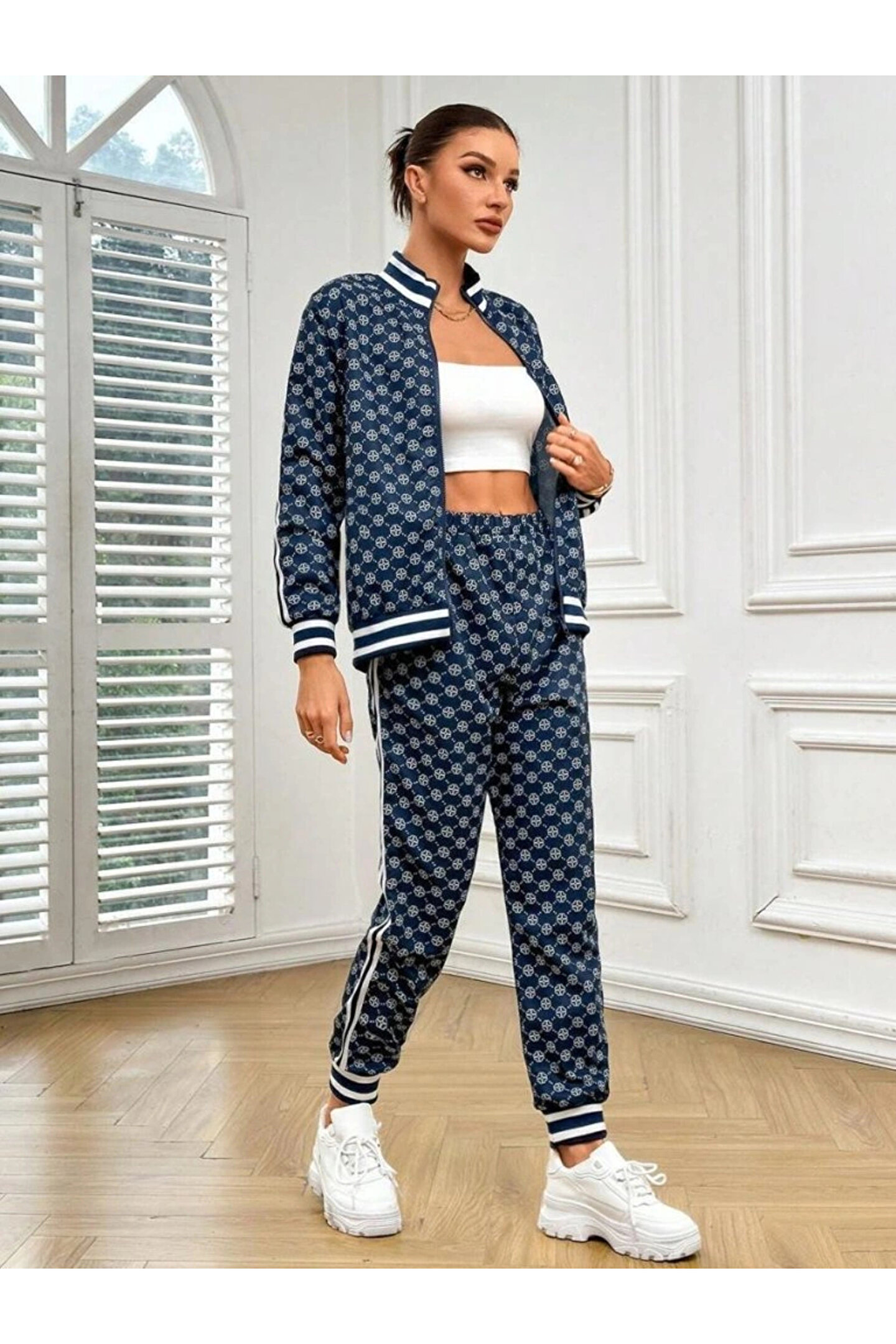 Kadın Uzun Kollu önden Fermuarlı Desenli Iki Iplik Bluz Ve Pantolon Ikili Takım