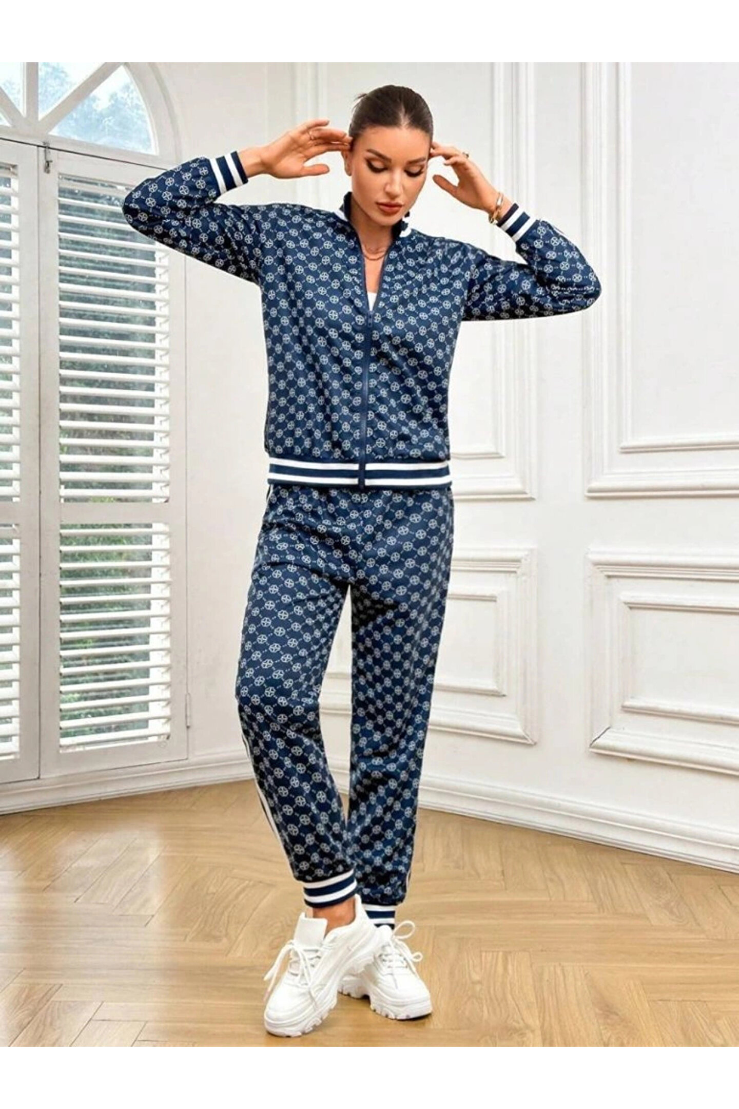 Kadın Uzun Kollu önden Fermuarlı Desenli Iki Iplik Bluz Ve Pantolon Ikili Takım