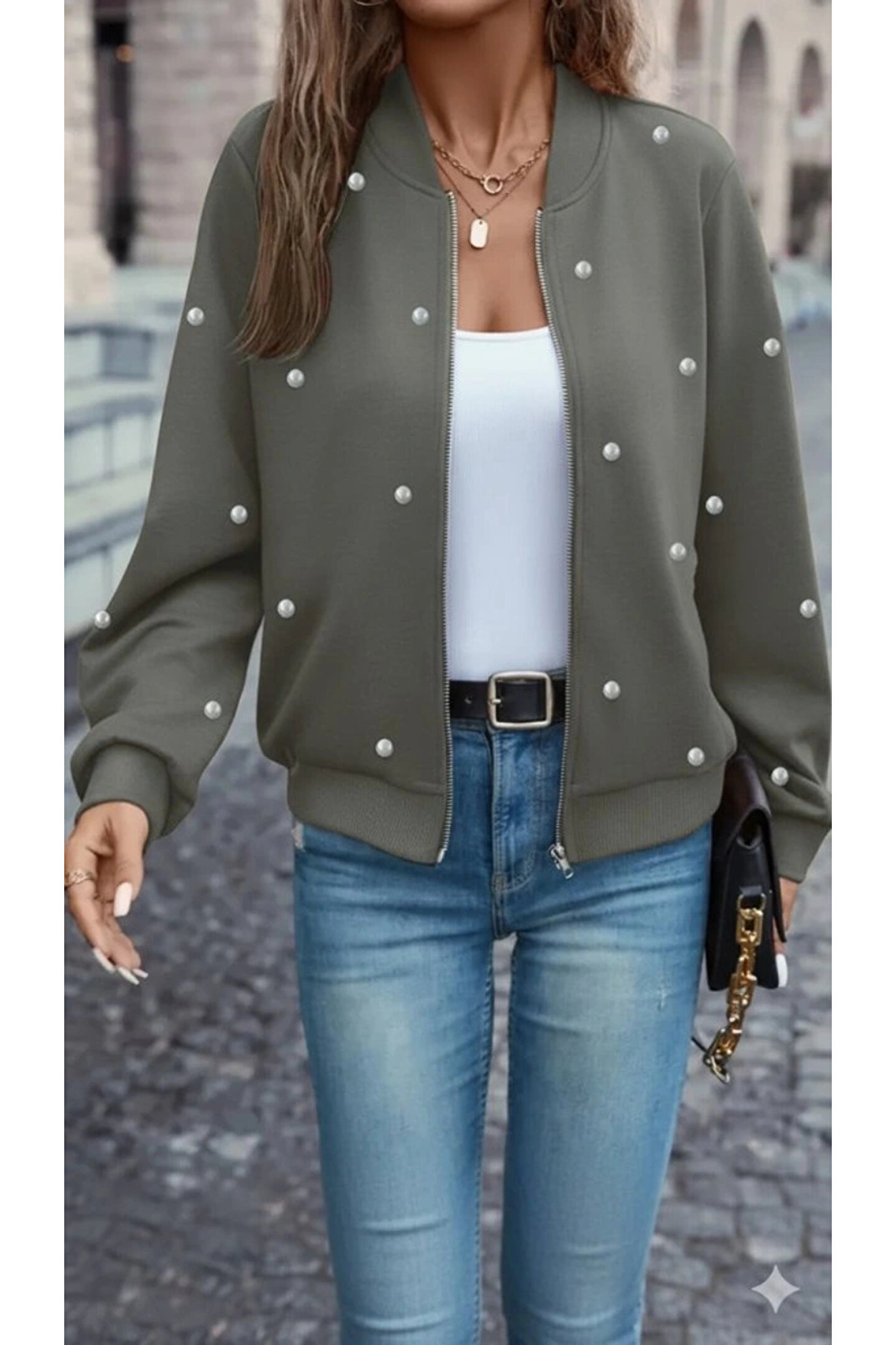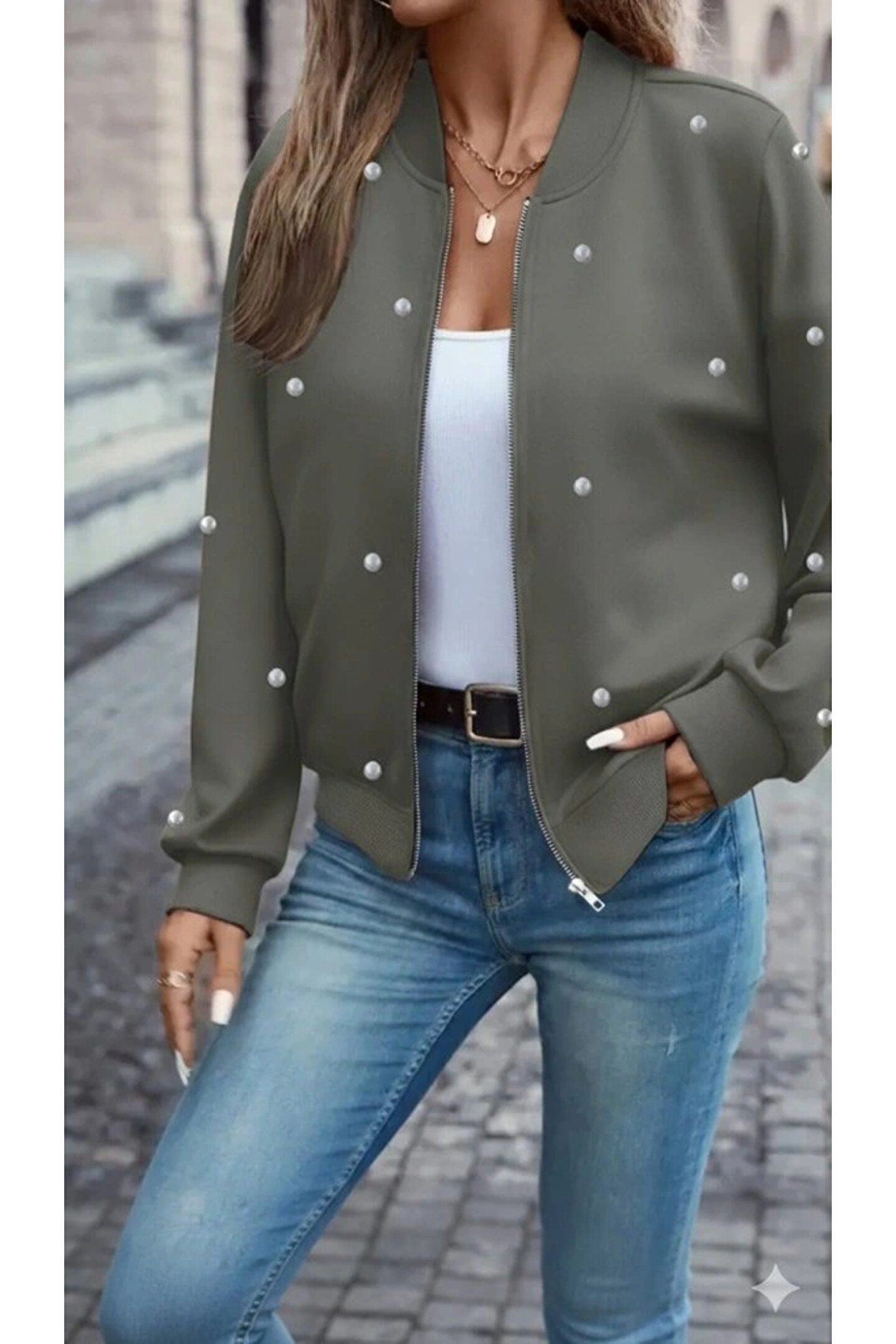 Kadın Uzun Kollu önden Fermuarlı Incili Kısa Modal Ceket