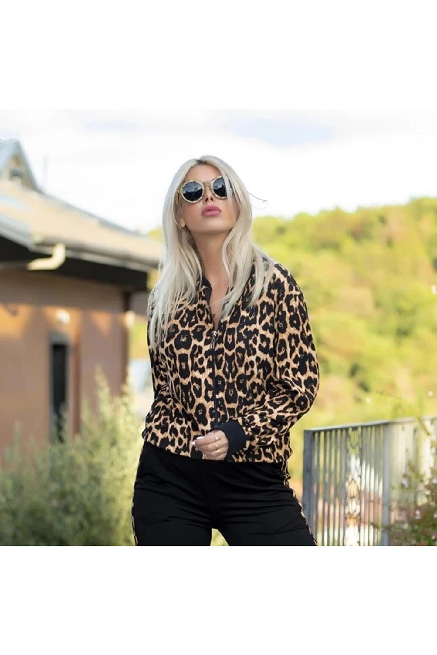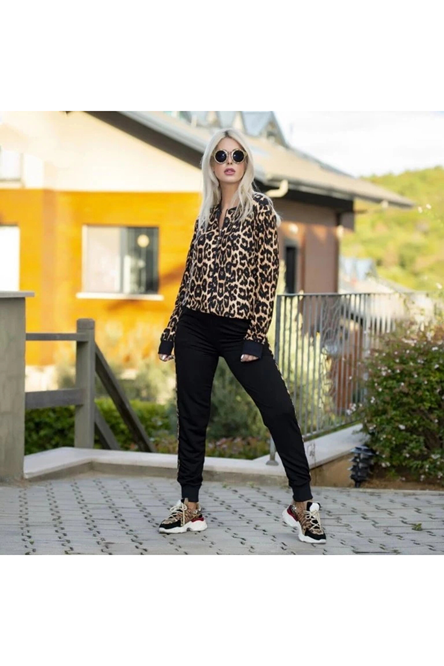 Kadın Uzun Kollu önden Fermuarlı Leopar Desen Detaylı Viskon Iki Iplik Bluz Ve Pantolon Ikili Takım
