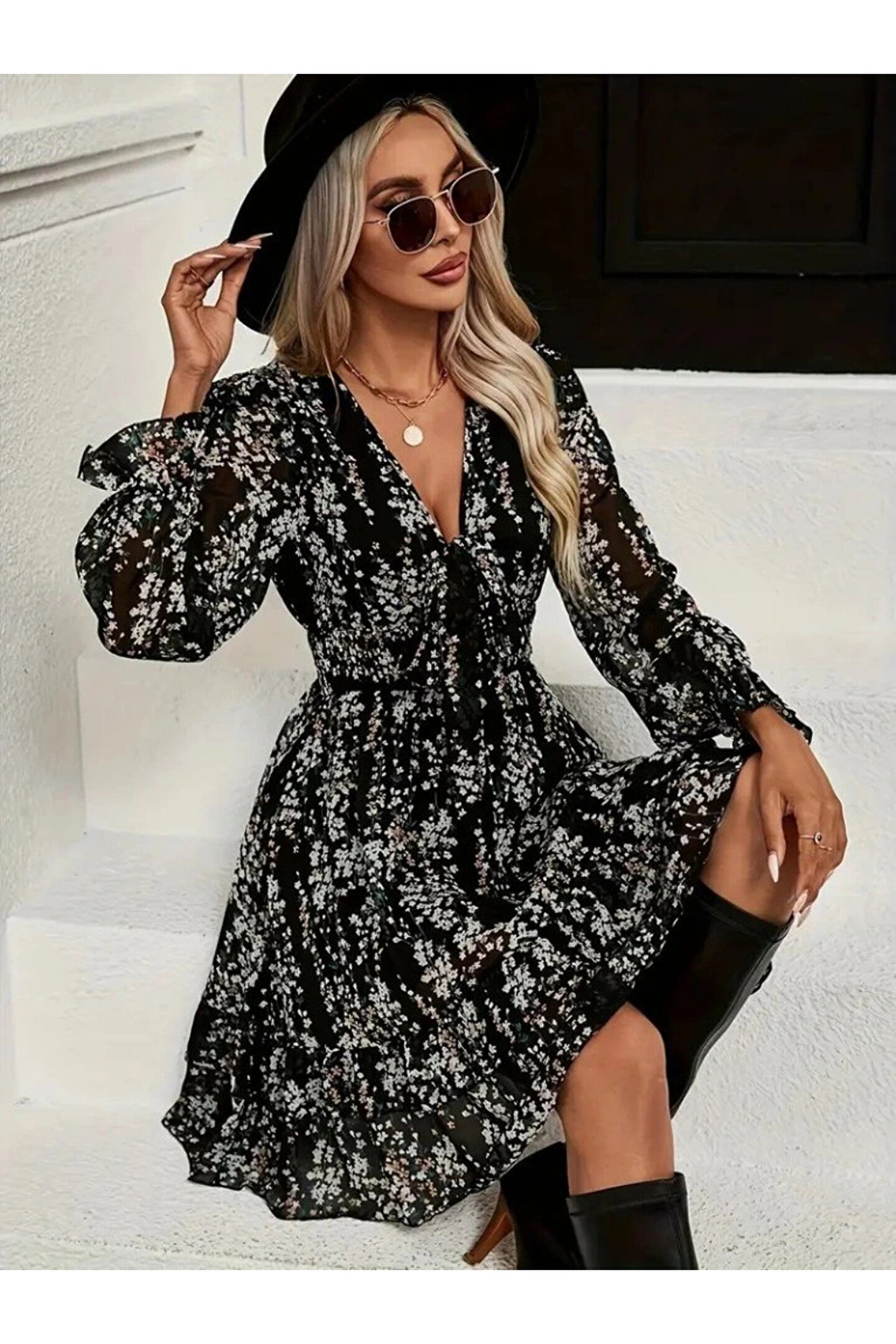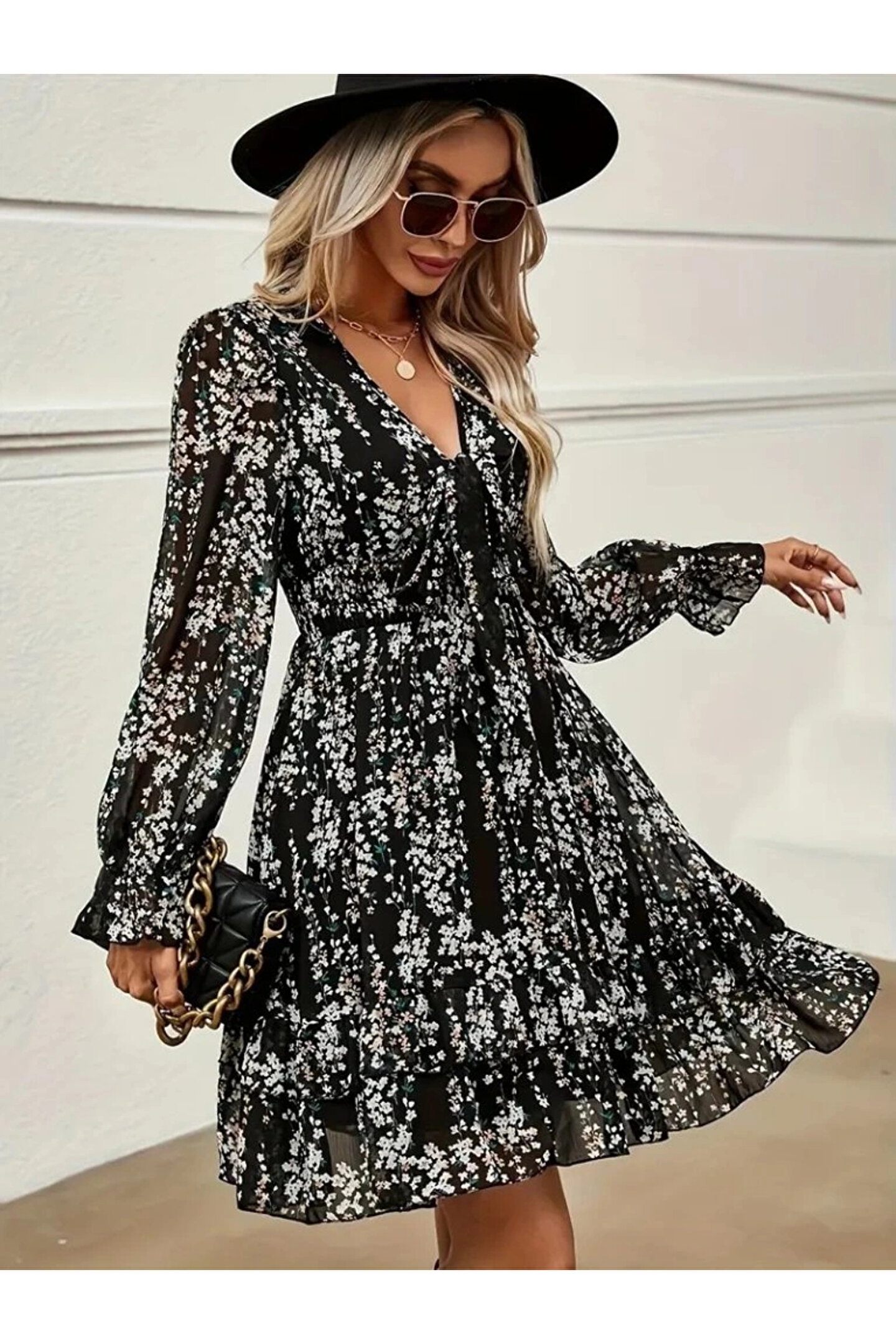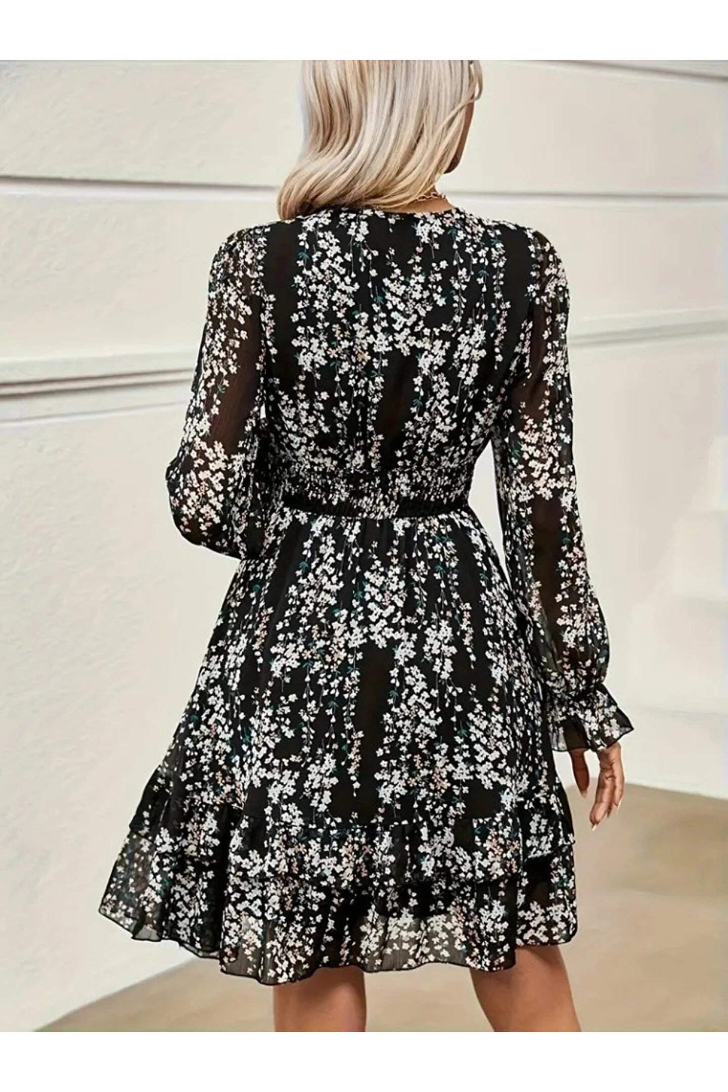 Kadın Uzun Kollu V Yakalı Fırfırlı Ve Bağcıklı şifon Mini Elbise