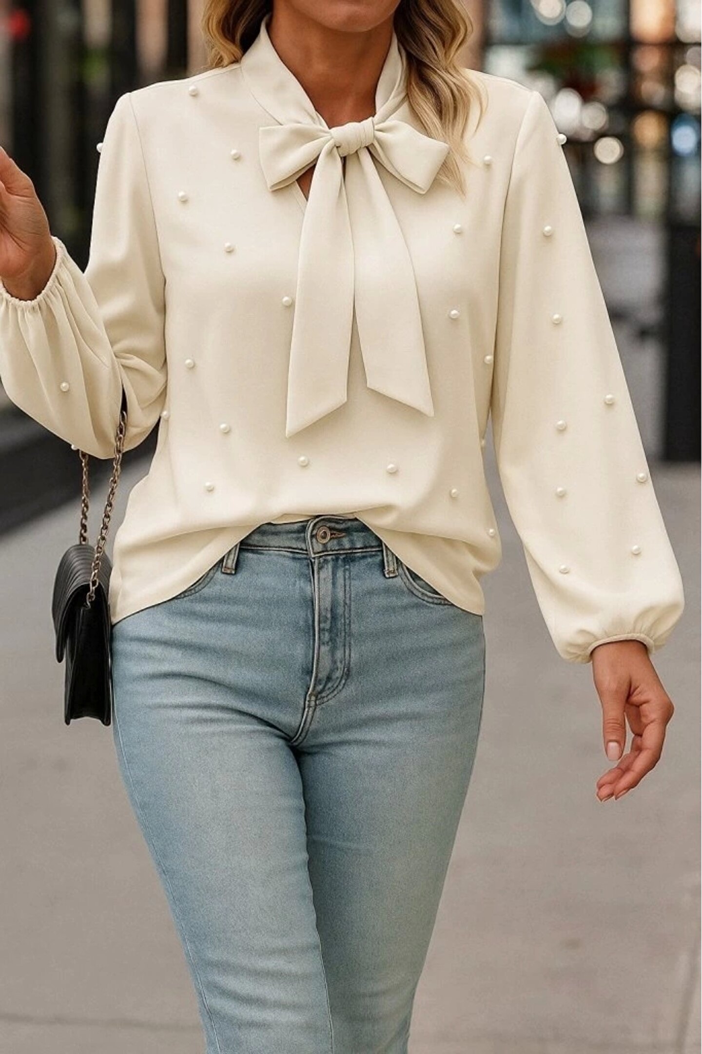 Kadın Uzun Kollu Yakadan Fiyonklu Incili Ithal Krep Bluz