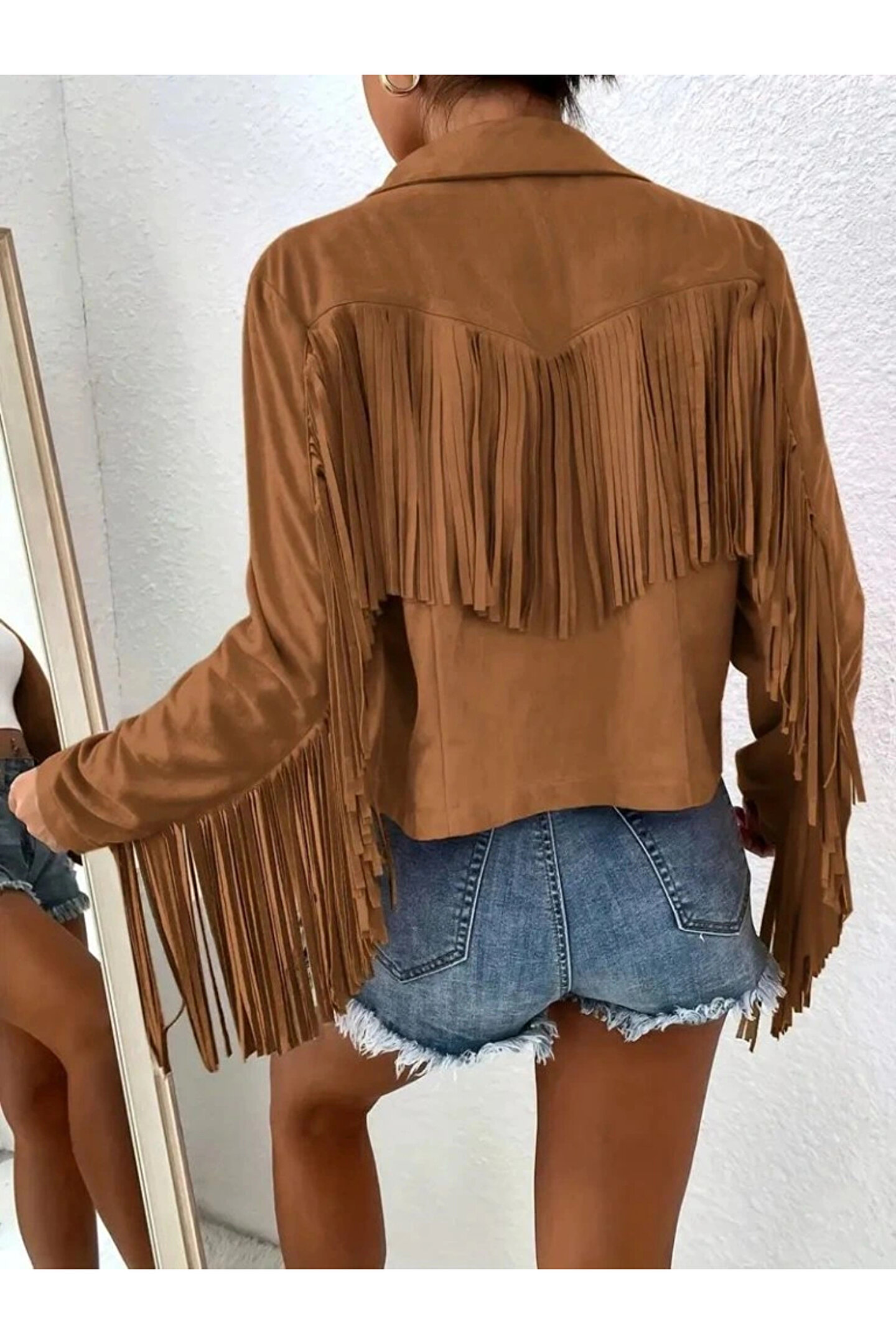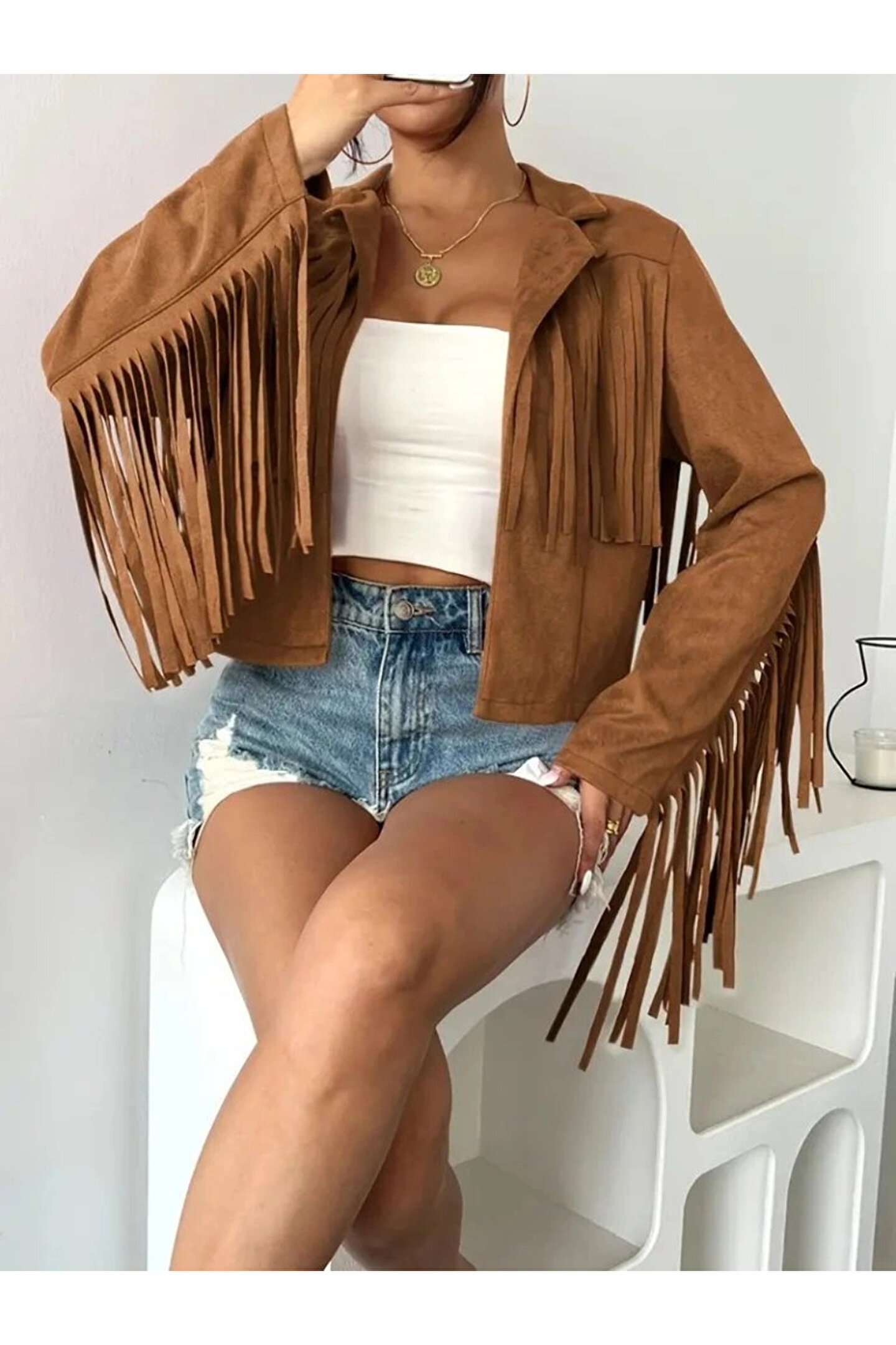 Kadın Uzun Kollu Yakalı Kısa Püsküllü Süet Ceket