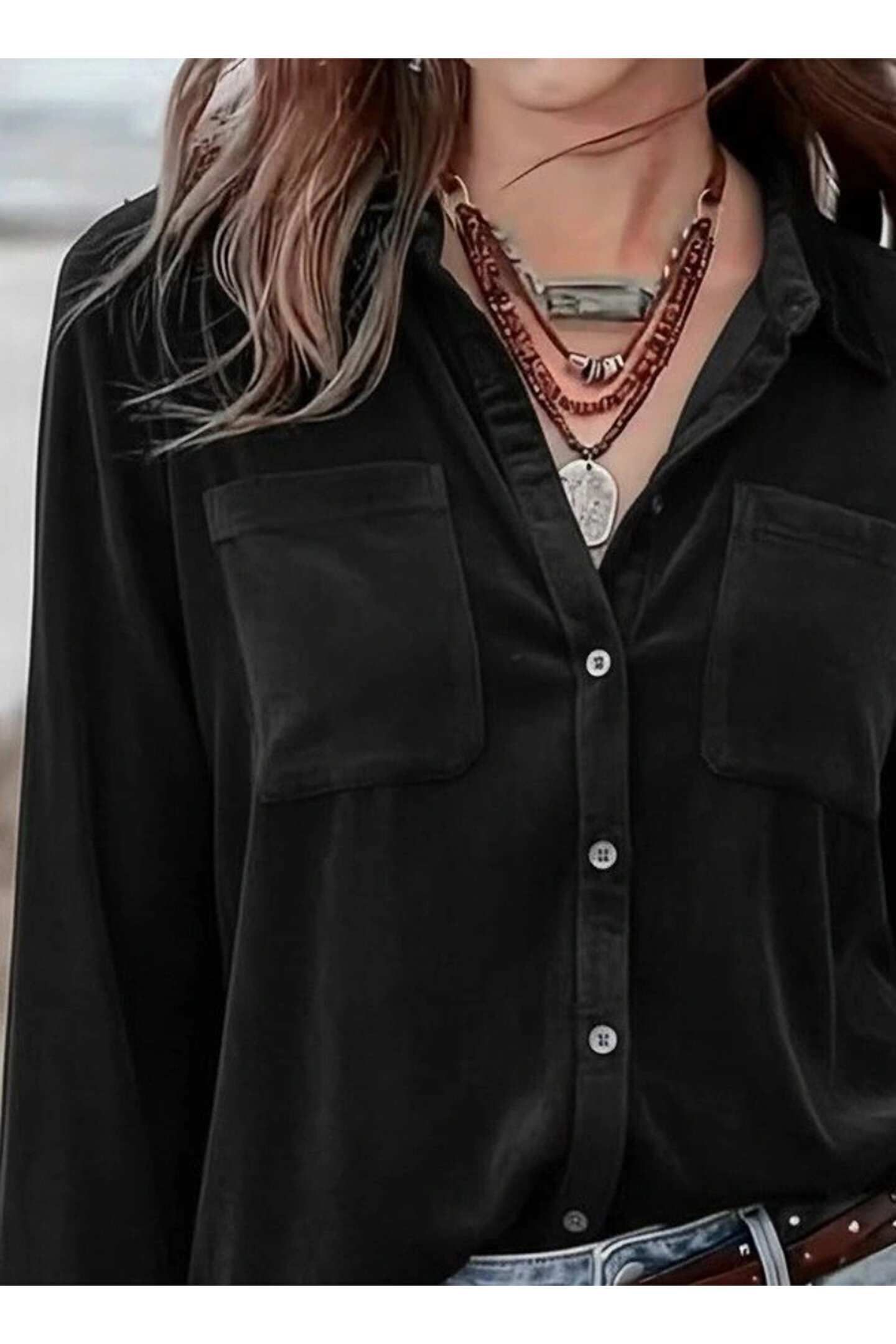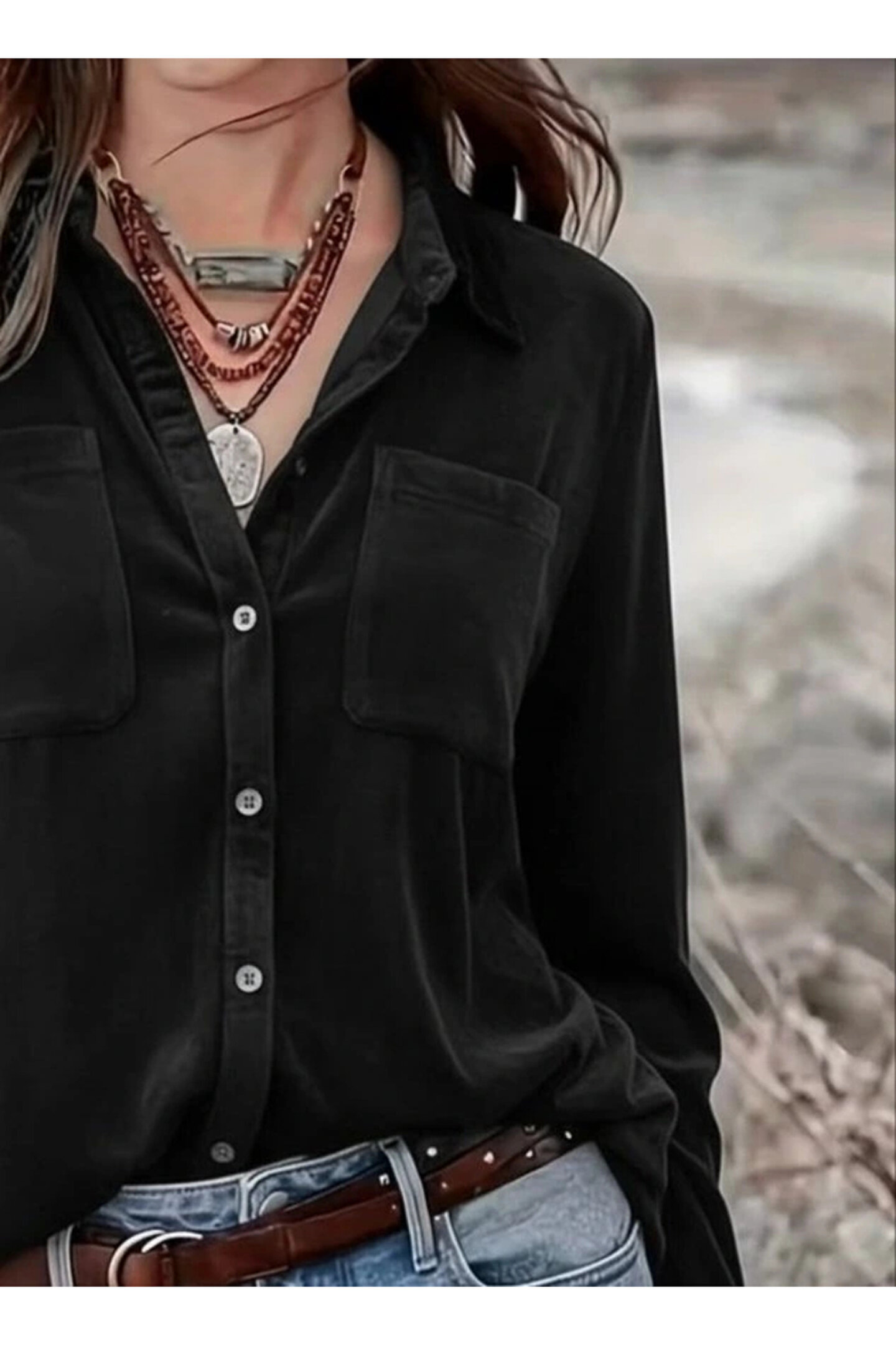 Silerra Kadın Uzun Kollu Yakalı önden Düğmeli Cep Detaylı Kadife Gömlek