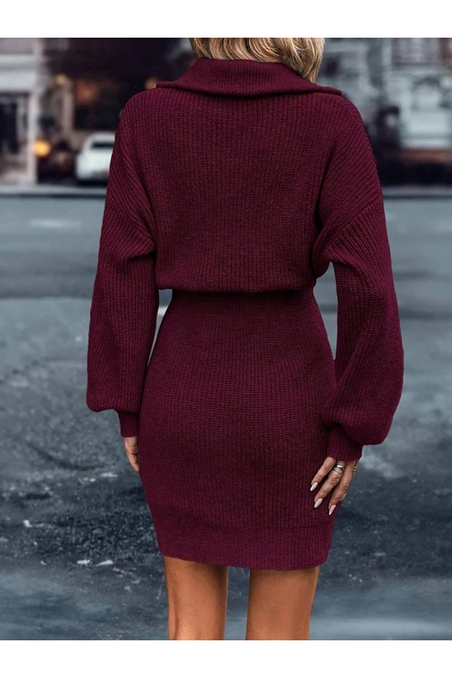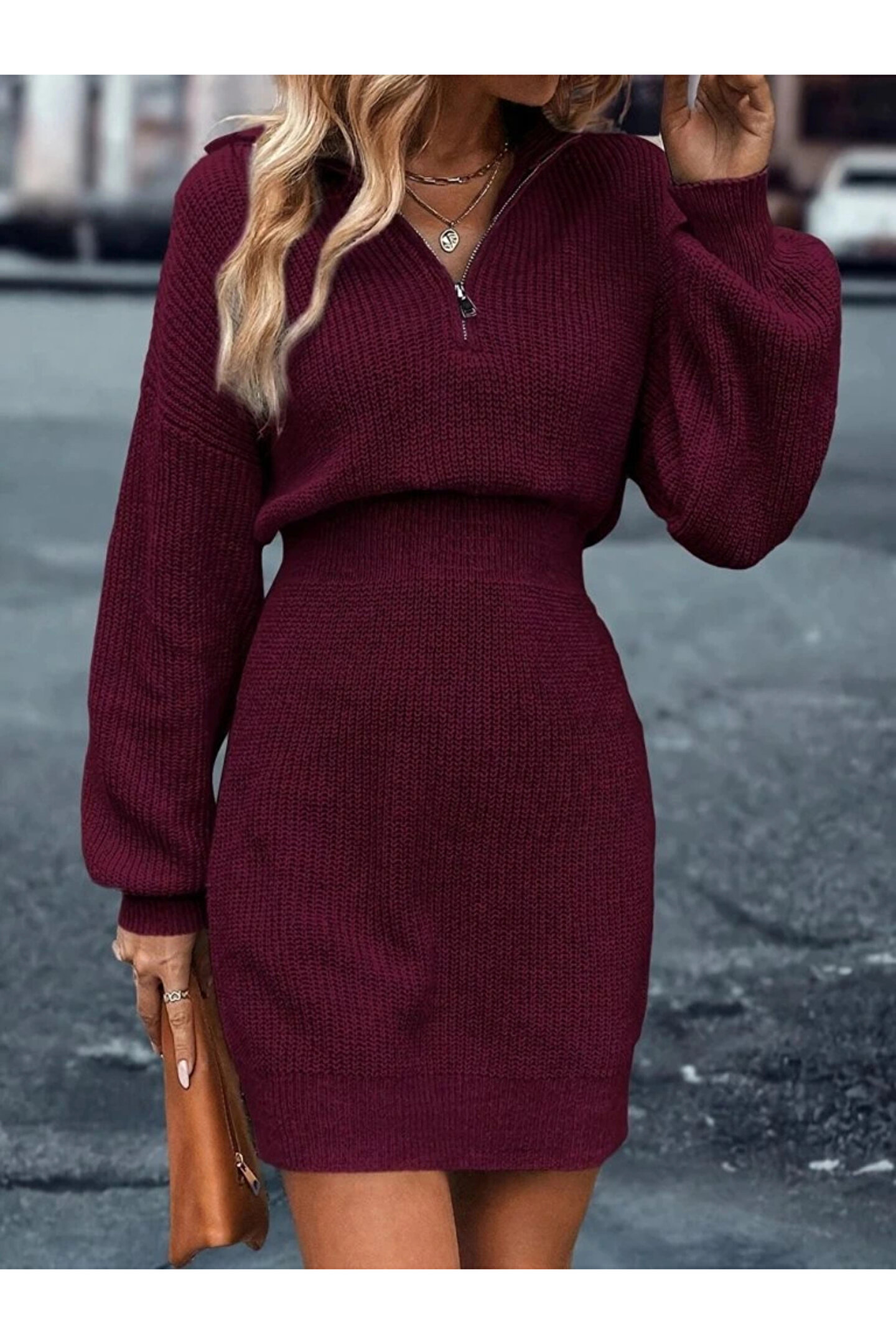 Kadın Uzun Kollu Yakası Fermuarlı Mini Triko Elbise