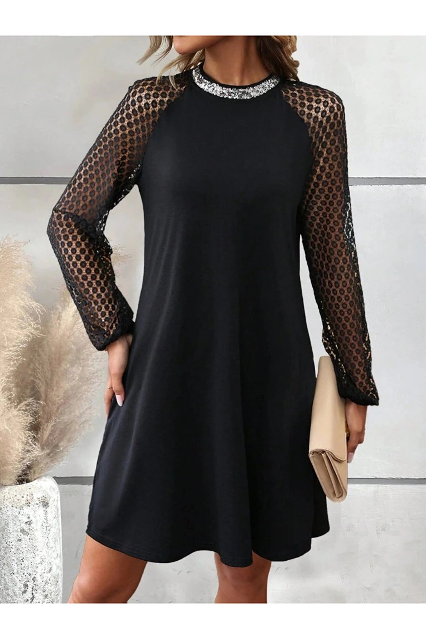 Kadın Uzun Kollu Yarı Balıkçı Yaka Pulpayetli Kolları Dantel Detaylı Mini Ithal Krep Elbise