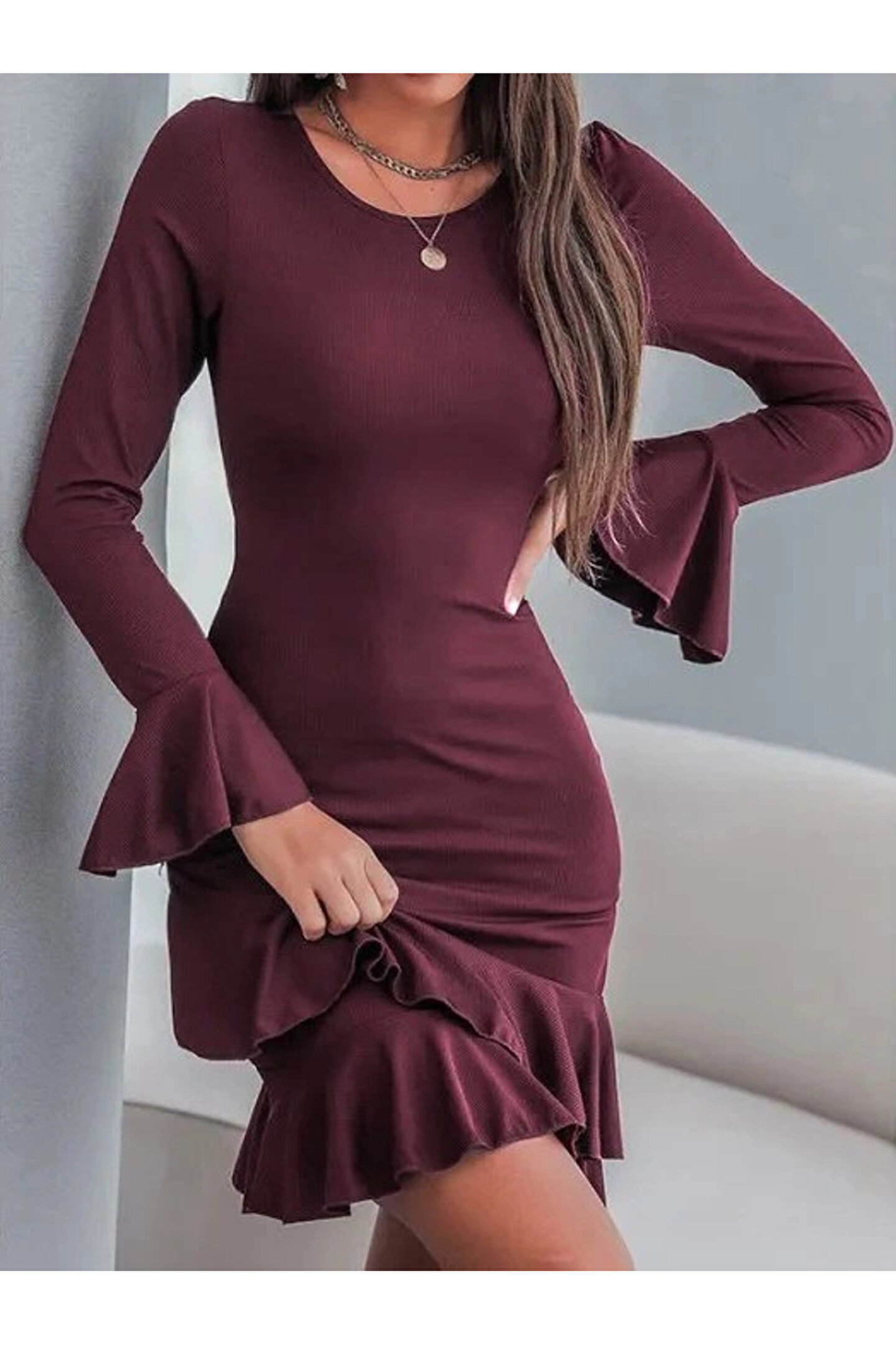 Kadın Uzun Kollu Yuvarlak Yaka Fırfırlı Kol Ucu Volanlı Janjan Krep Mini Elbise