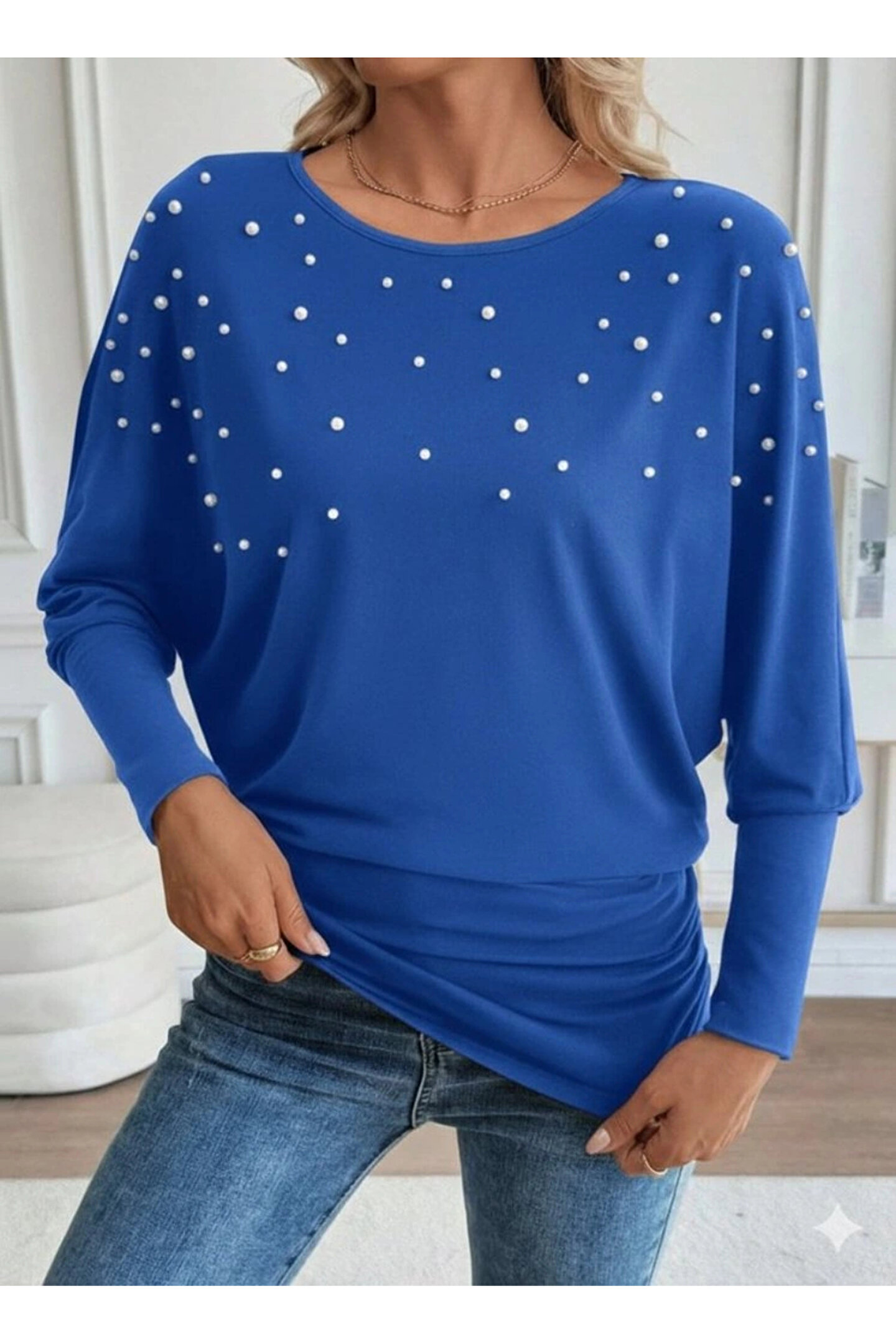 Kadın Uzun Kollu Yuvarlak Yaka Incili Viskon Bluz