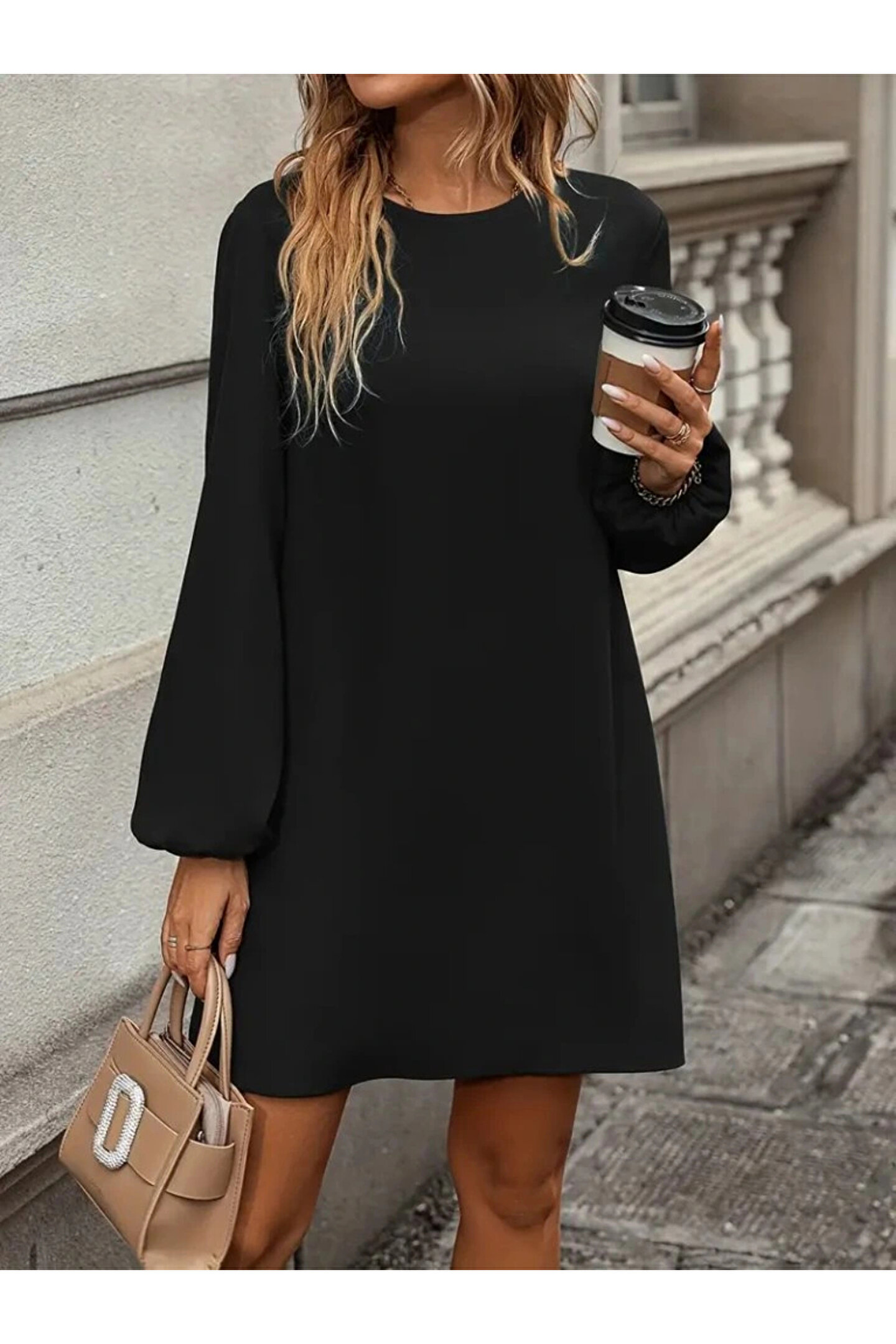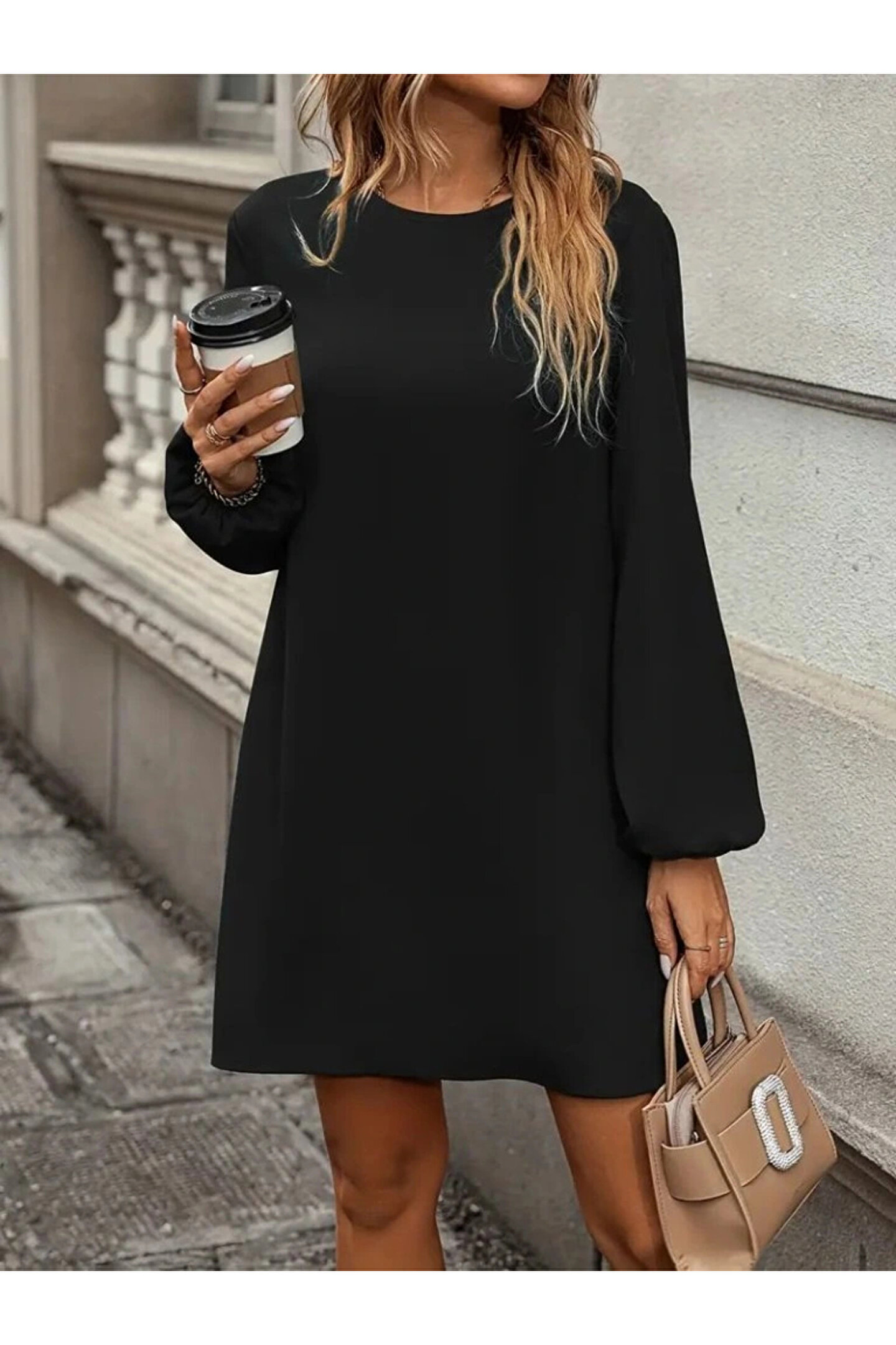 Kadın Uzun Kollu Yuvarlak Yaka Mini Ithal Krep Elbise