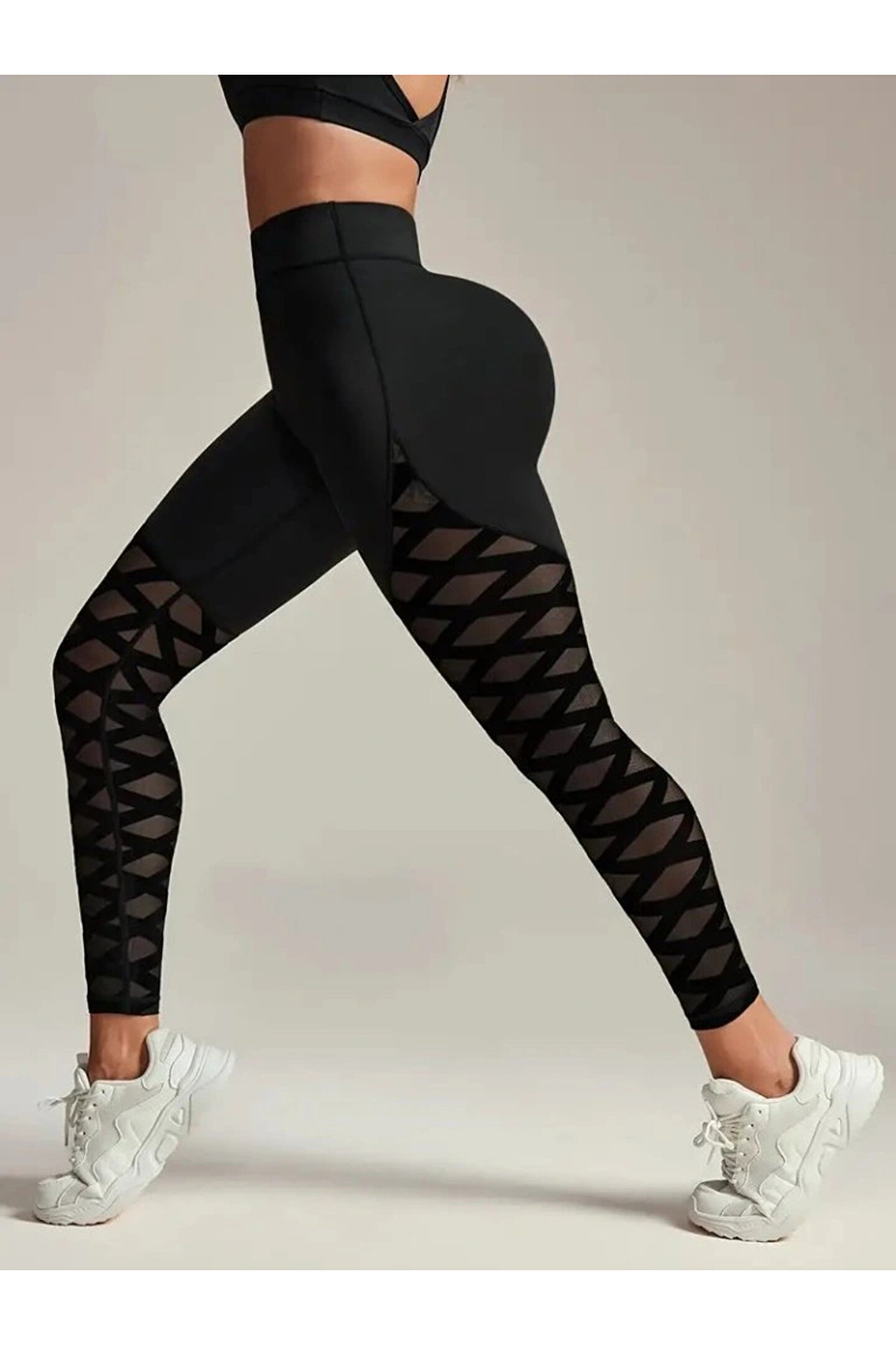 Kadın Yüksek Bel çapraz Desen Tül Detaylı Spor Dalgıç Tayt