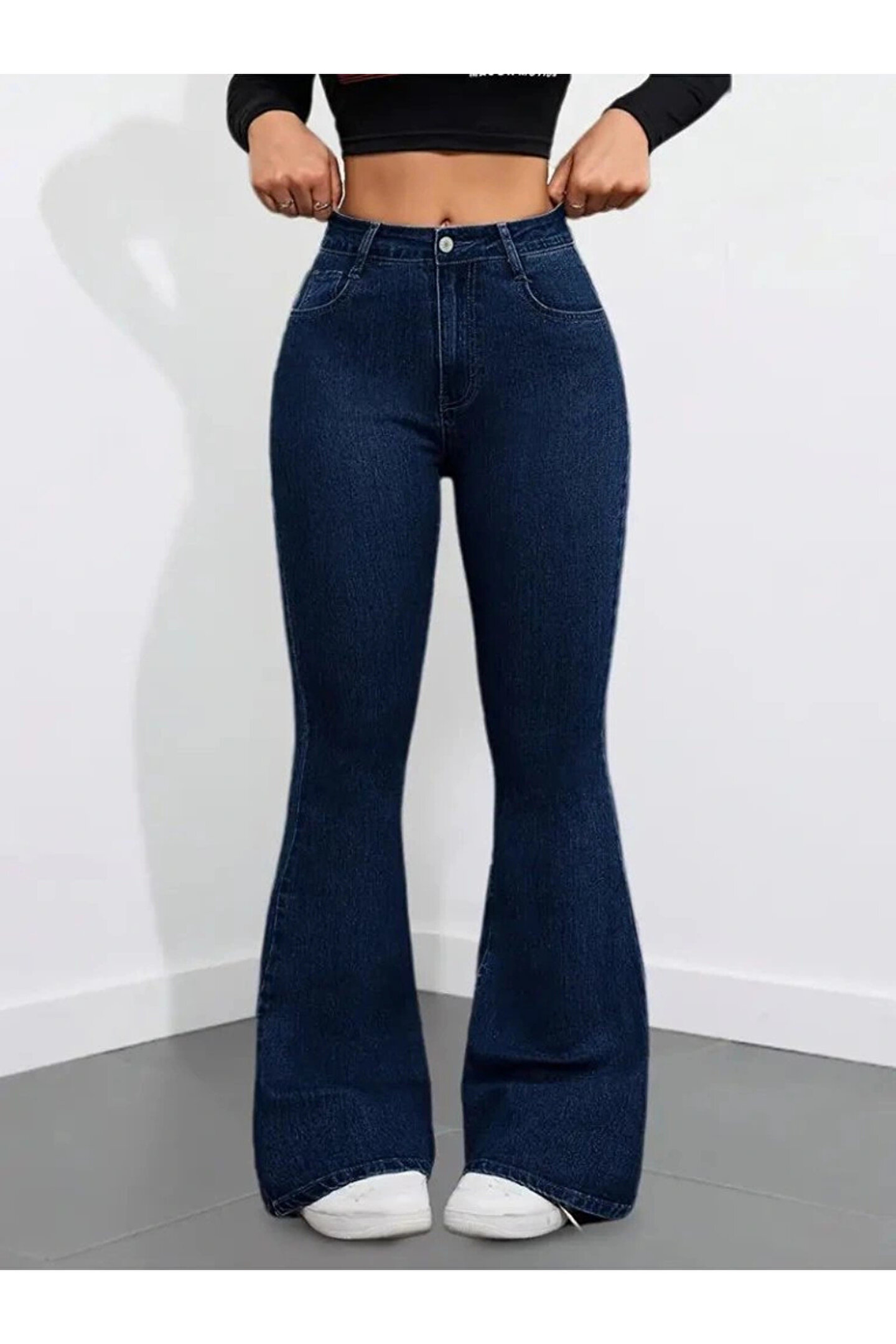 Kadın Yüksek Bel Cepli İspanyol Paçalı Kot Pantolon