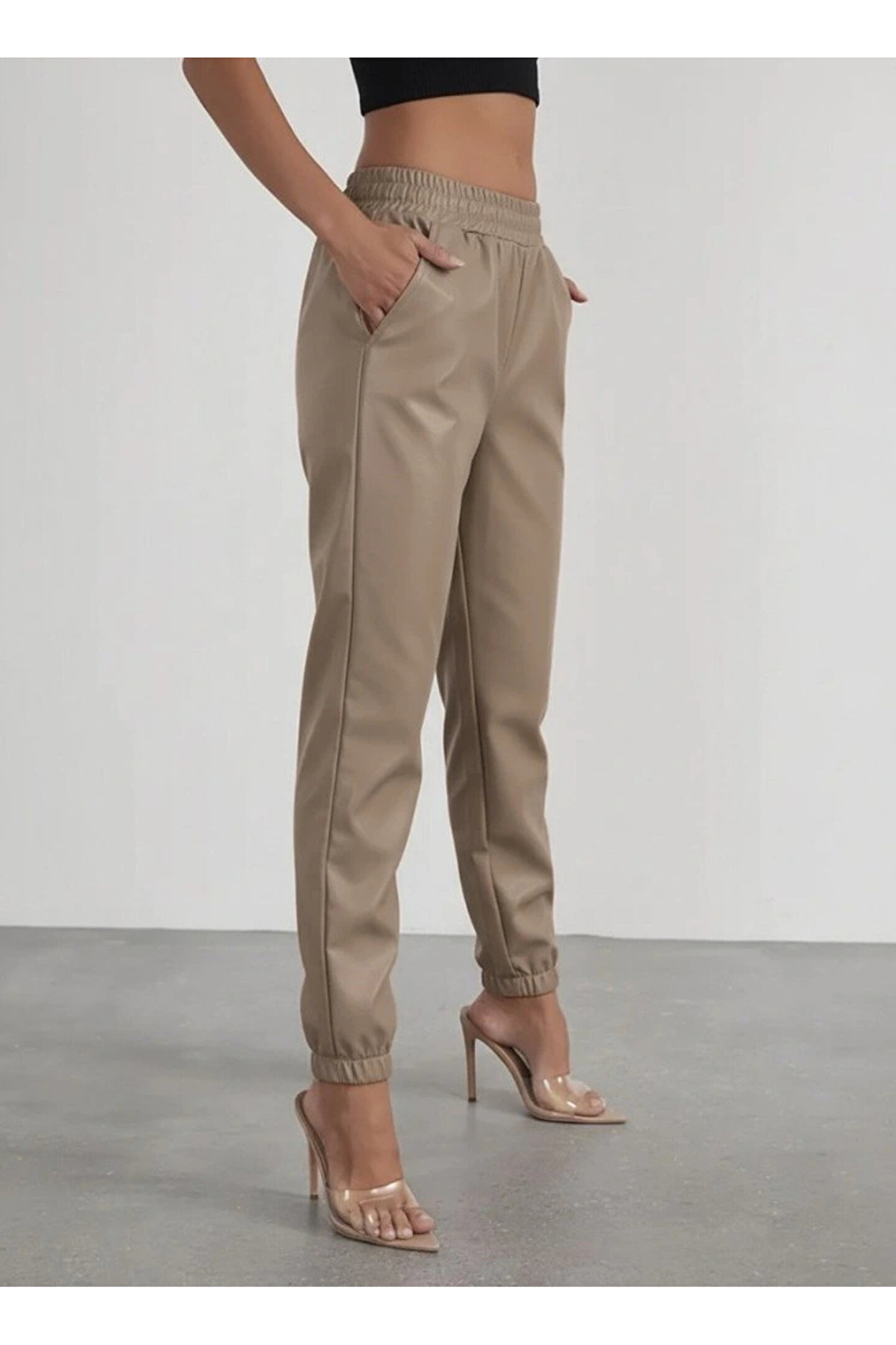 Silerra Kadın Yüksek Bel Lastikli önü Düğmeli Deri Pantolon