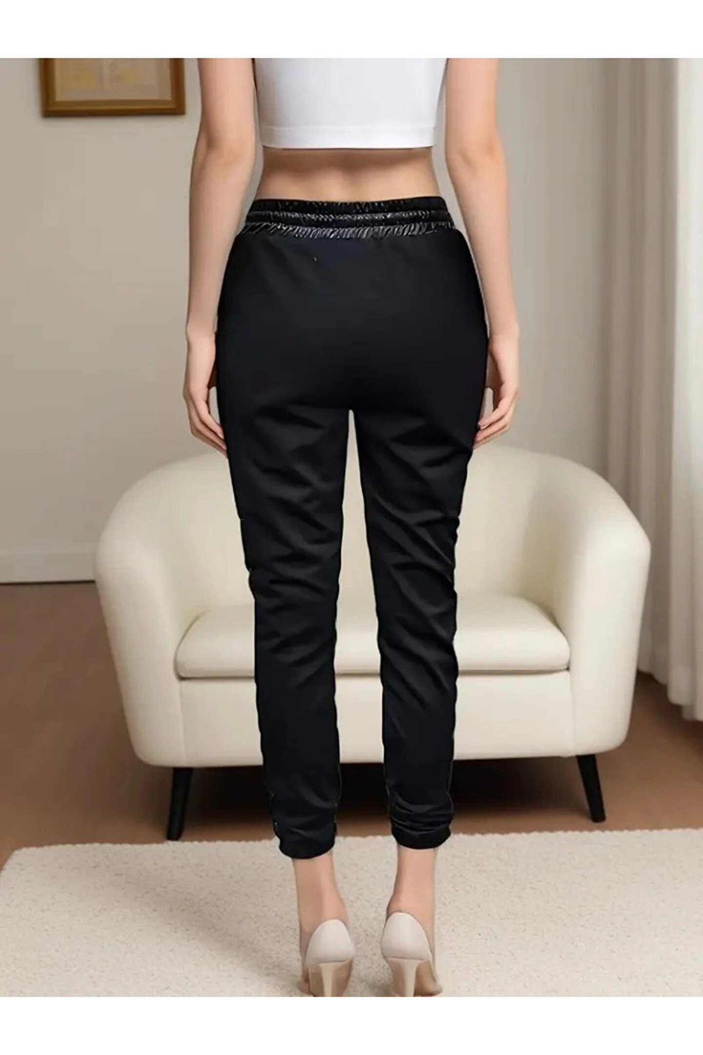 Kadın Yüksek Bel Lastikli Yanda Dantel Detaylı Bağcıklı Deri Pantolon