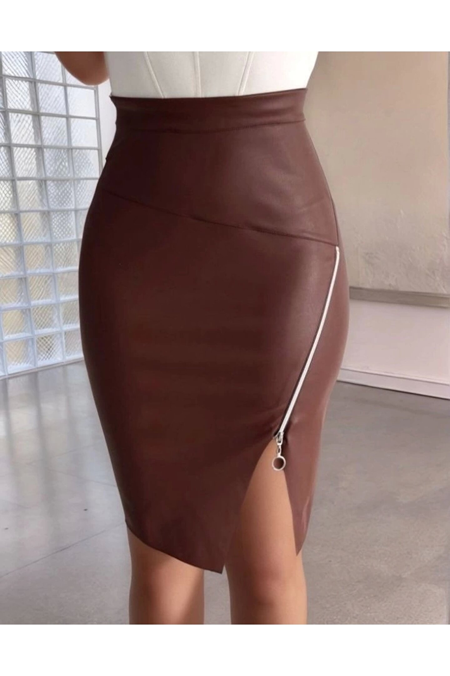 Kadın Yüksek Bel Yandan Fermuarlı Ve Yırtmaçlı Deri Etek