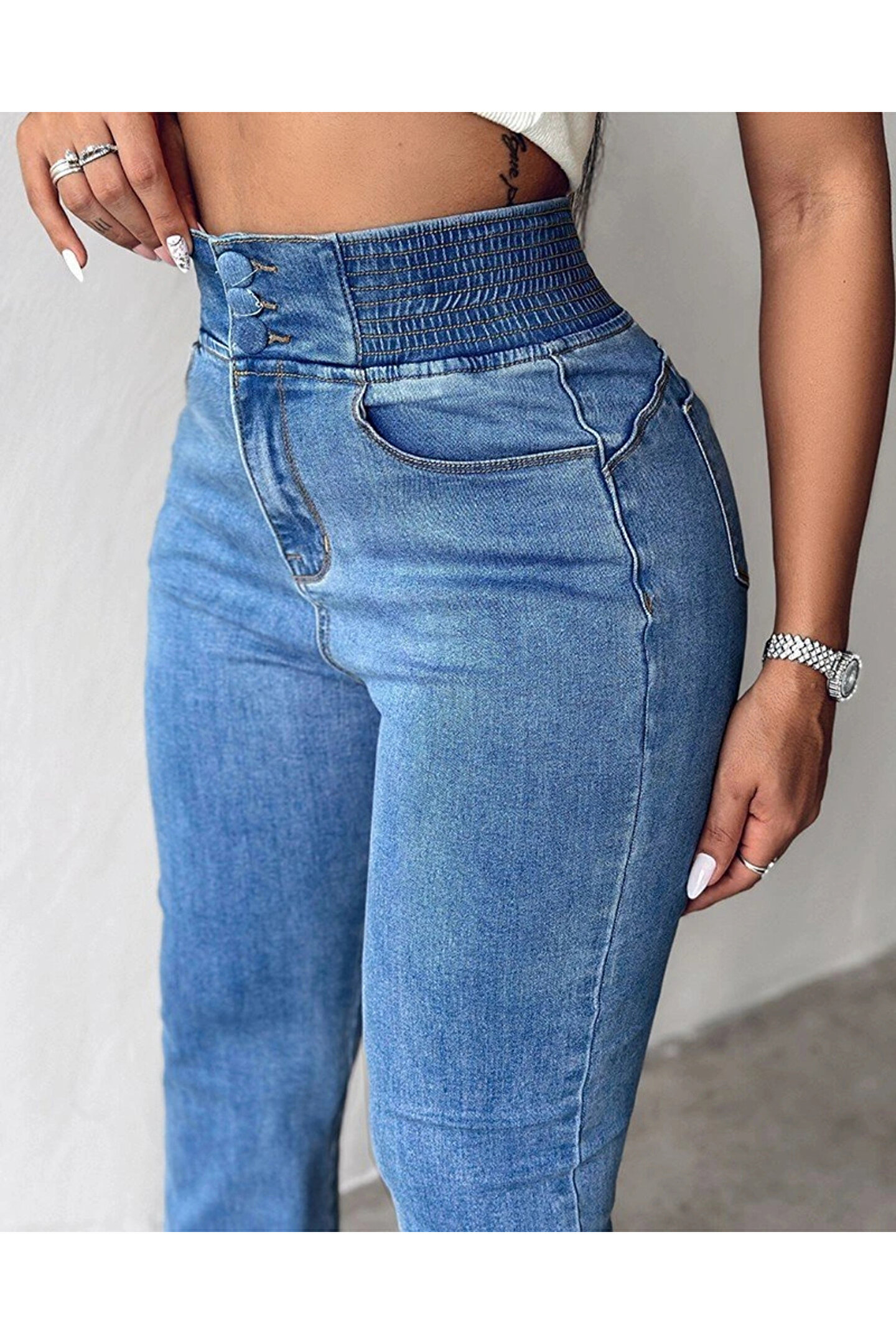 Silerra Kadın Yüksek Bel Yanları Lastik önü Düğmeli Kot Pantolon