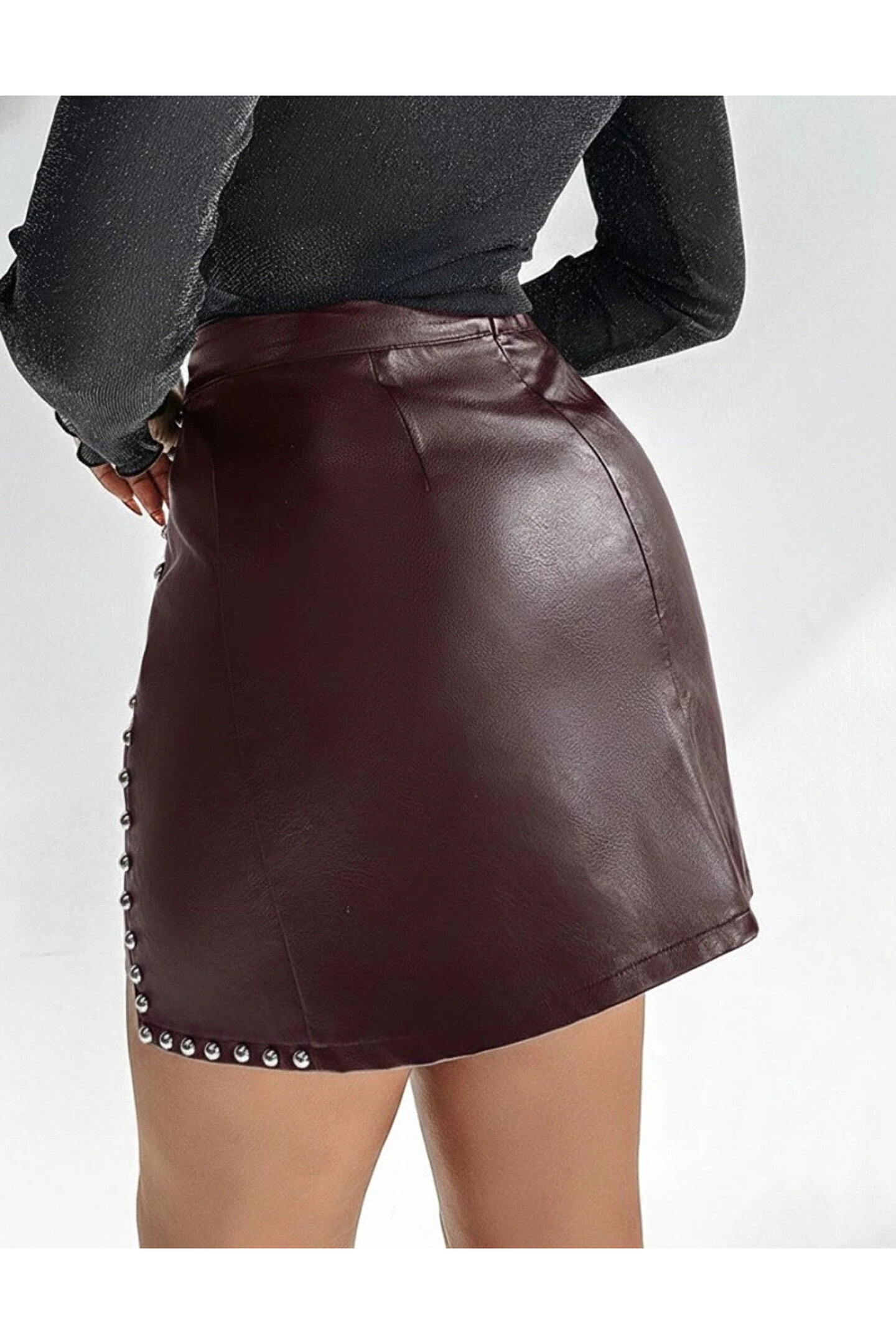 Kadın Yüksek Belli Yandan çivili Mini Deri Etek