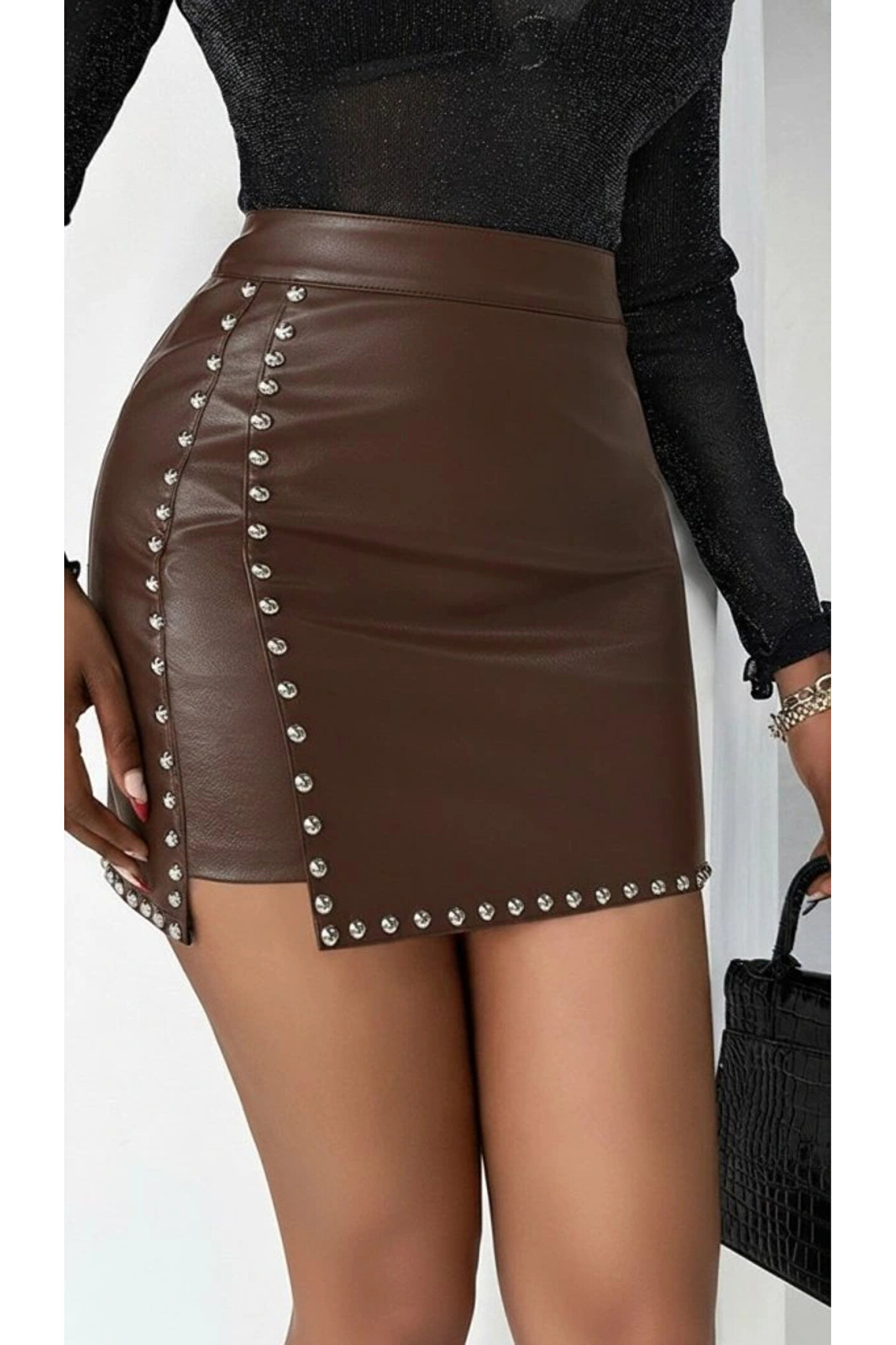 Kadın Yüksek Belli Yandan çivili Mini Deri Etek
