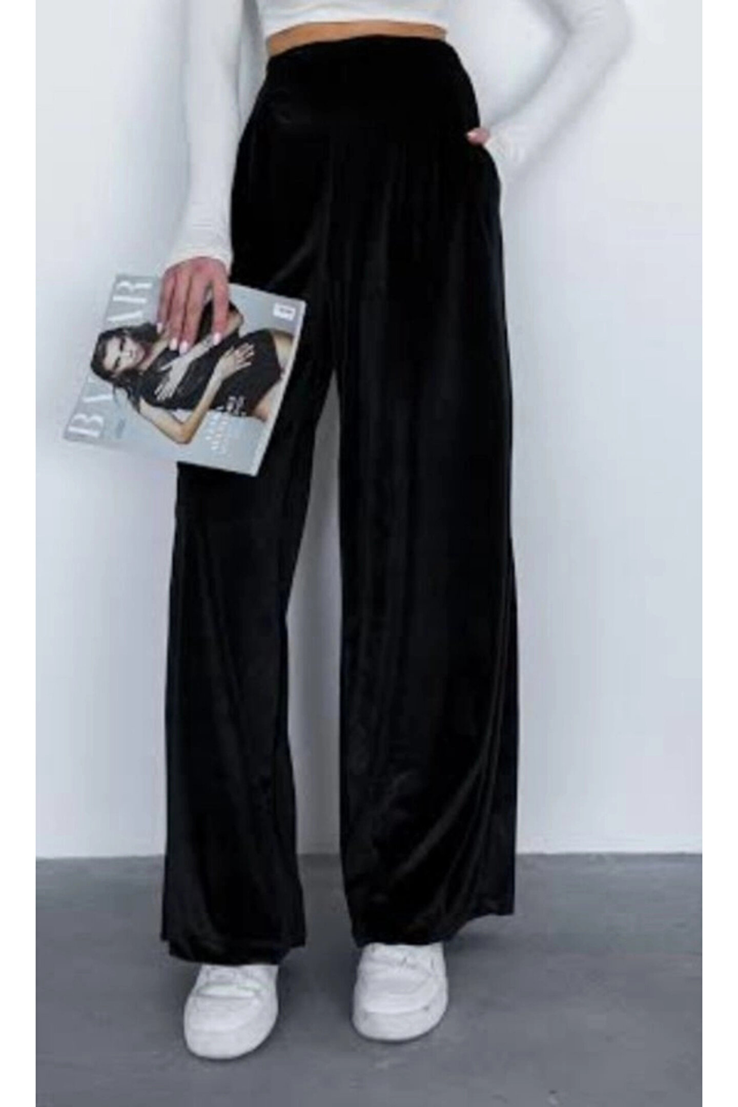Kadın Yüksek Ben Beli Lastik Detay Kadife Kumaş Bol Paça Pantolon