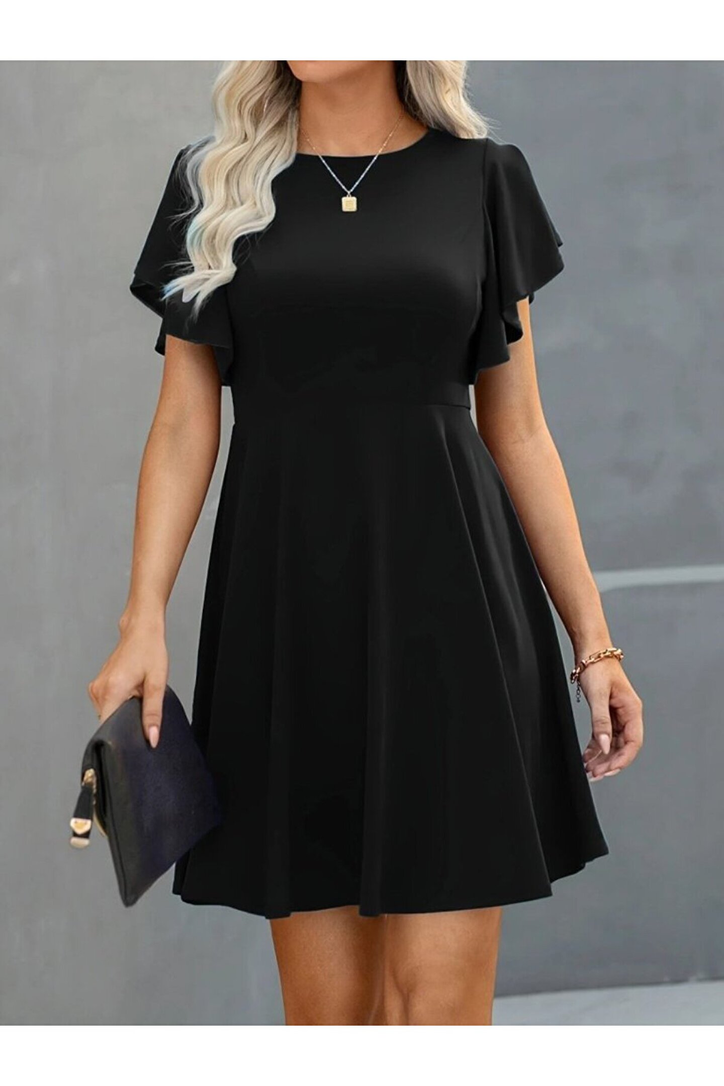 Silerra Kendim Fashion Kadın Kısa Kelebek Kollu Bisiklet Yaka Janjan Krep Elbise