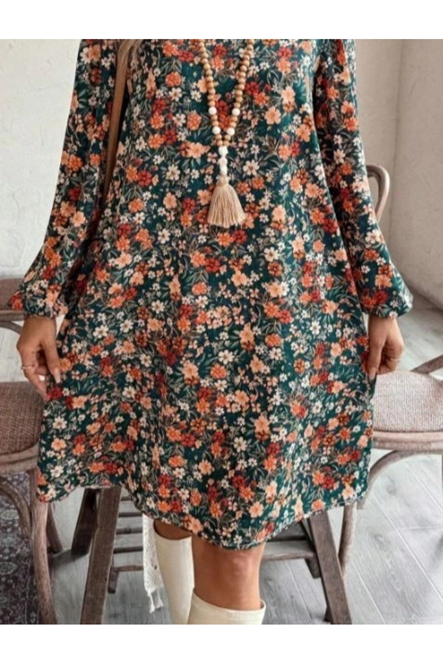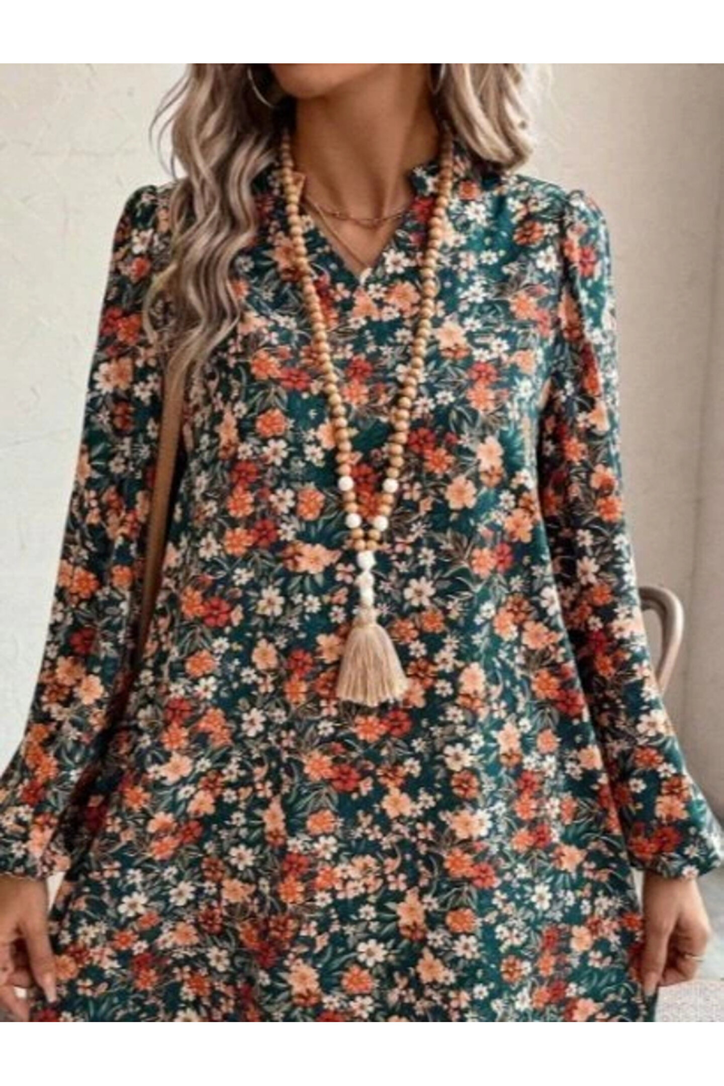 Kadın Uzun Kollu V Yakalı Desenli Modal Mini Elbise