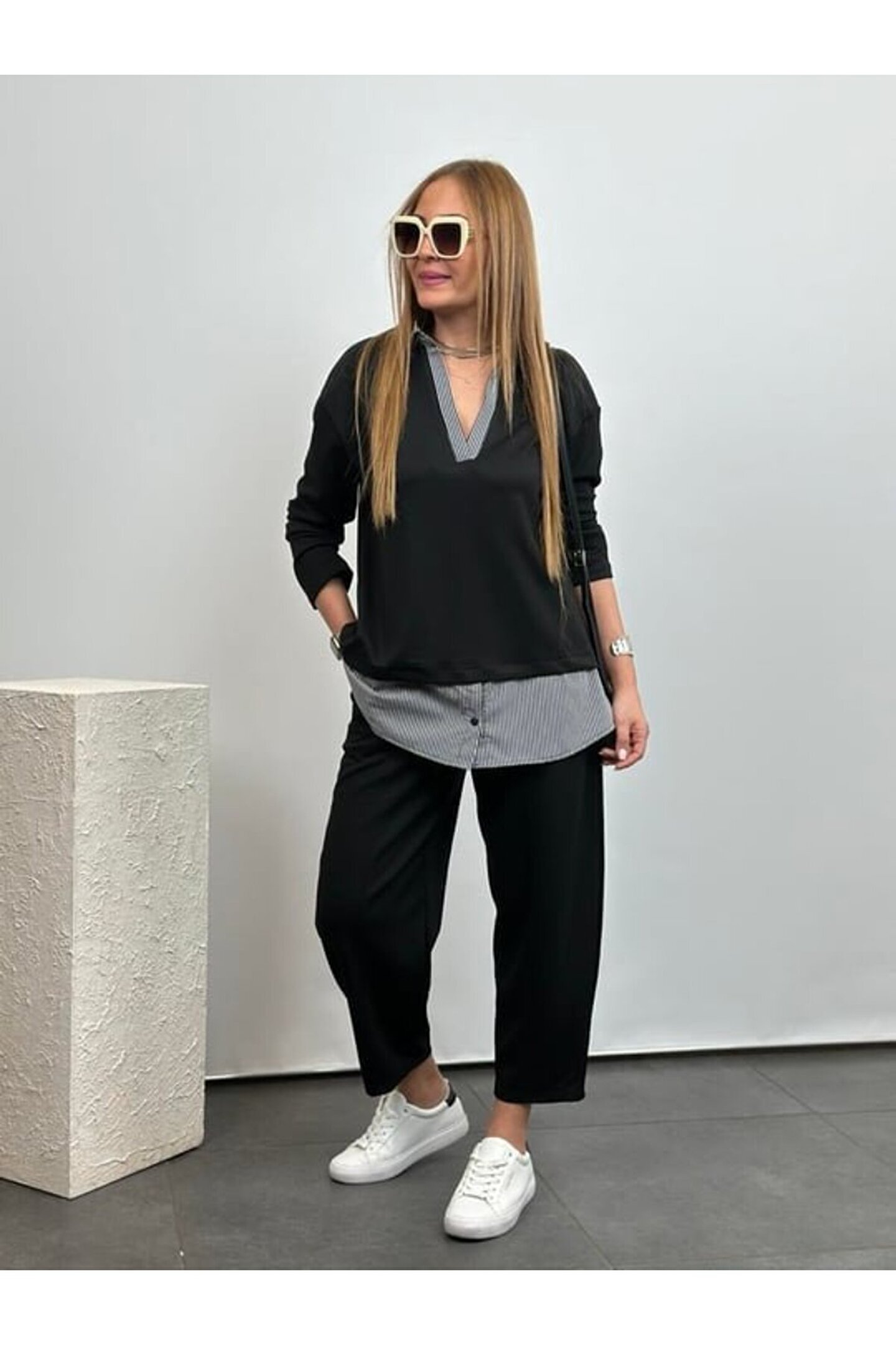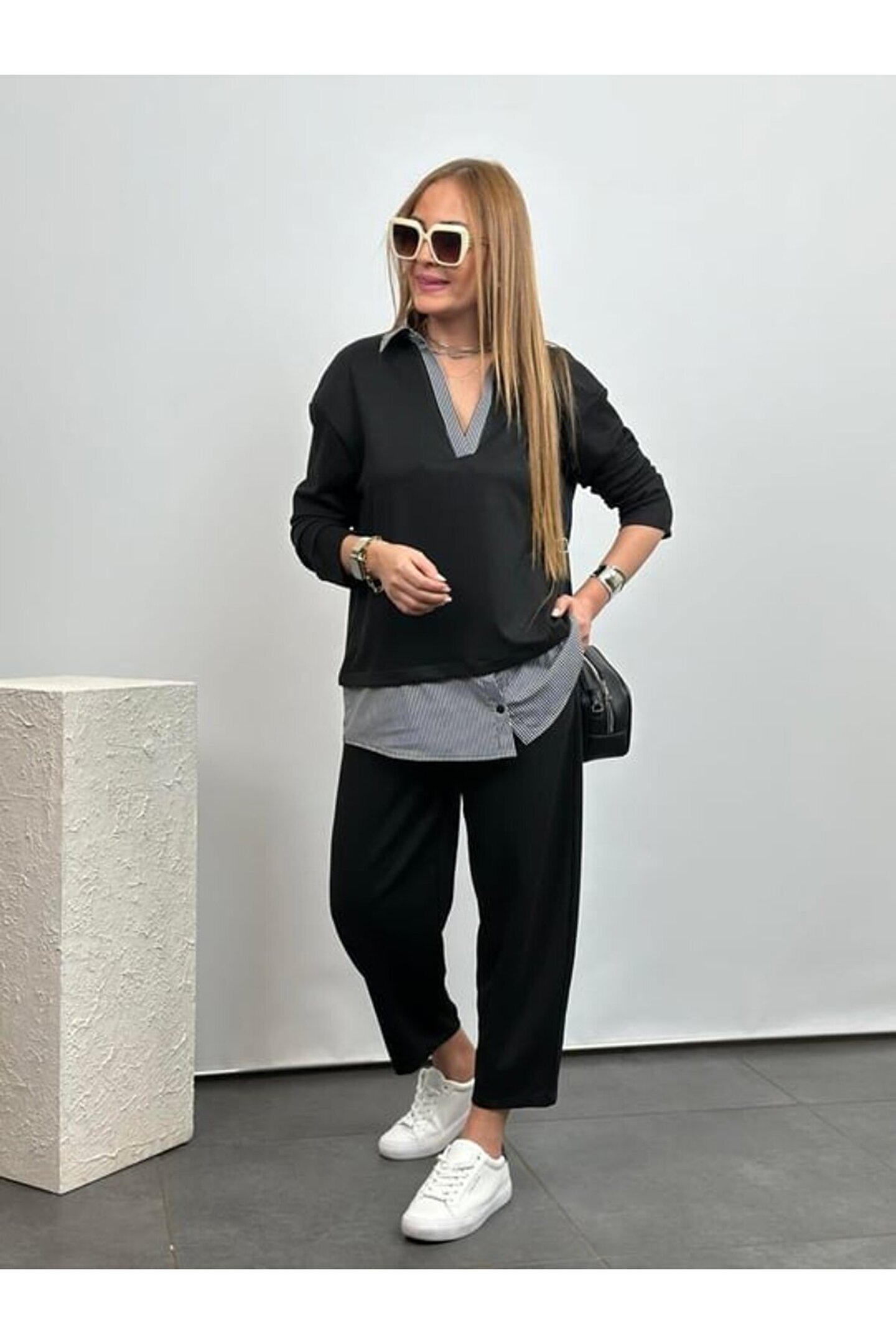 Polo Yaka Gömlek Detay Salaş Balon Pantolunlu ıkılı Takım