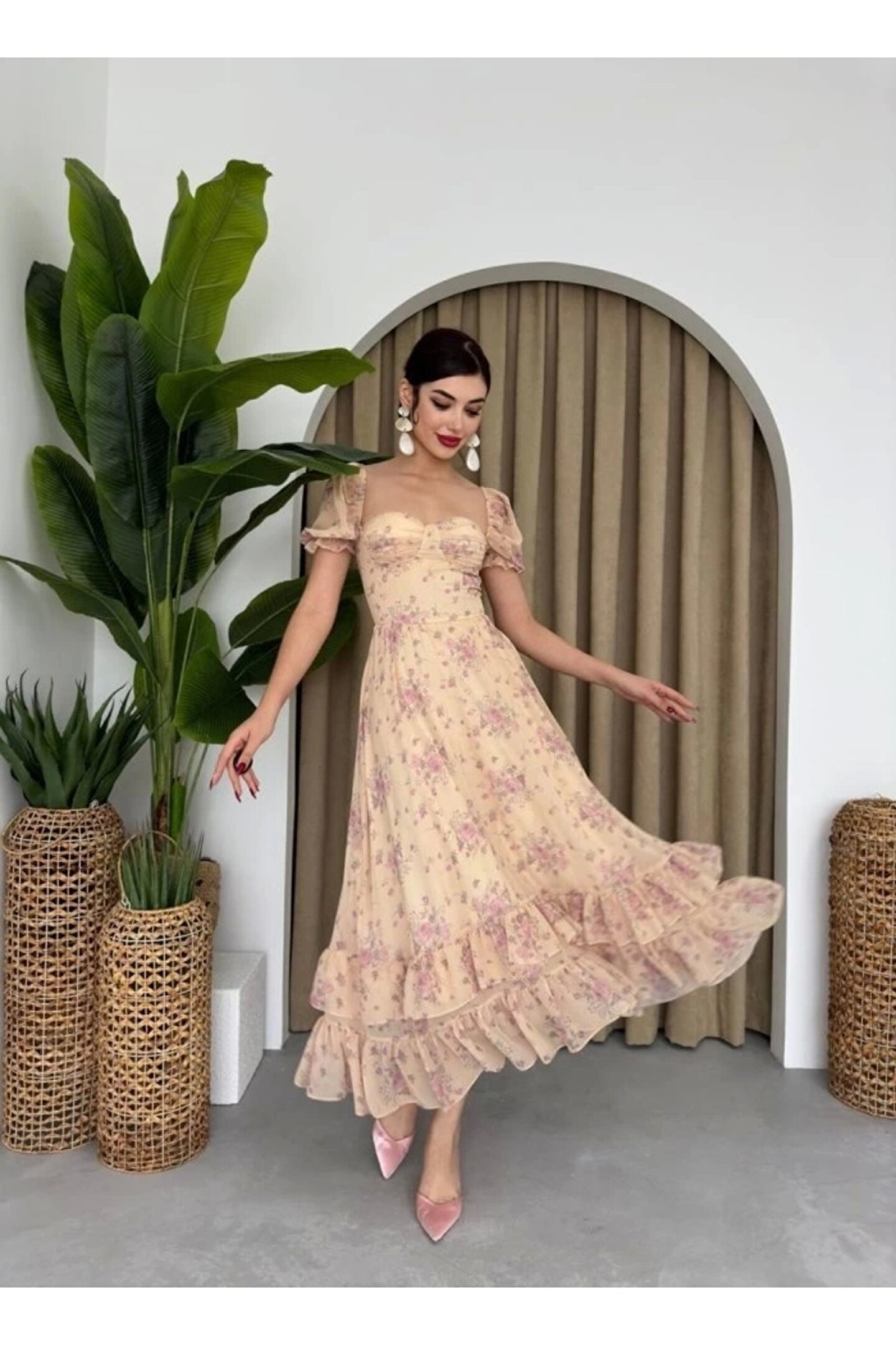 ŞİFON KUMAŞ DİJİTAL DESEN BASKILI ELBİSE