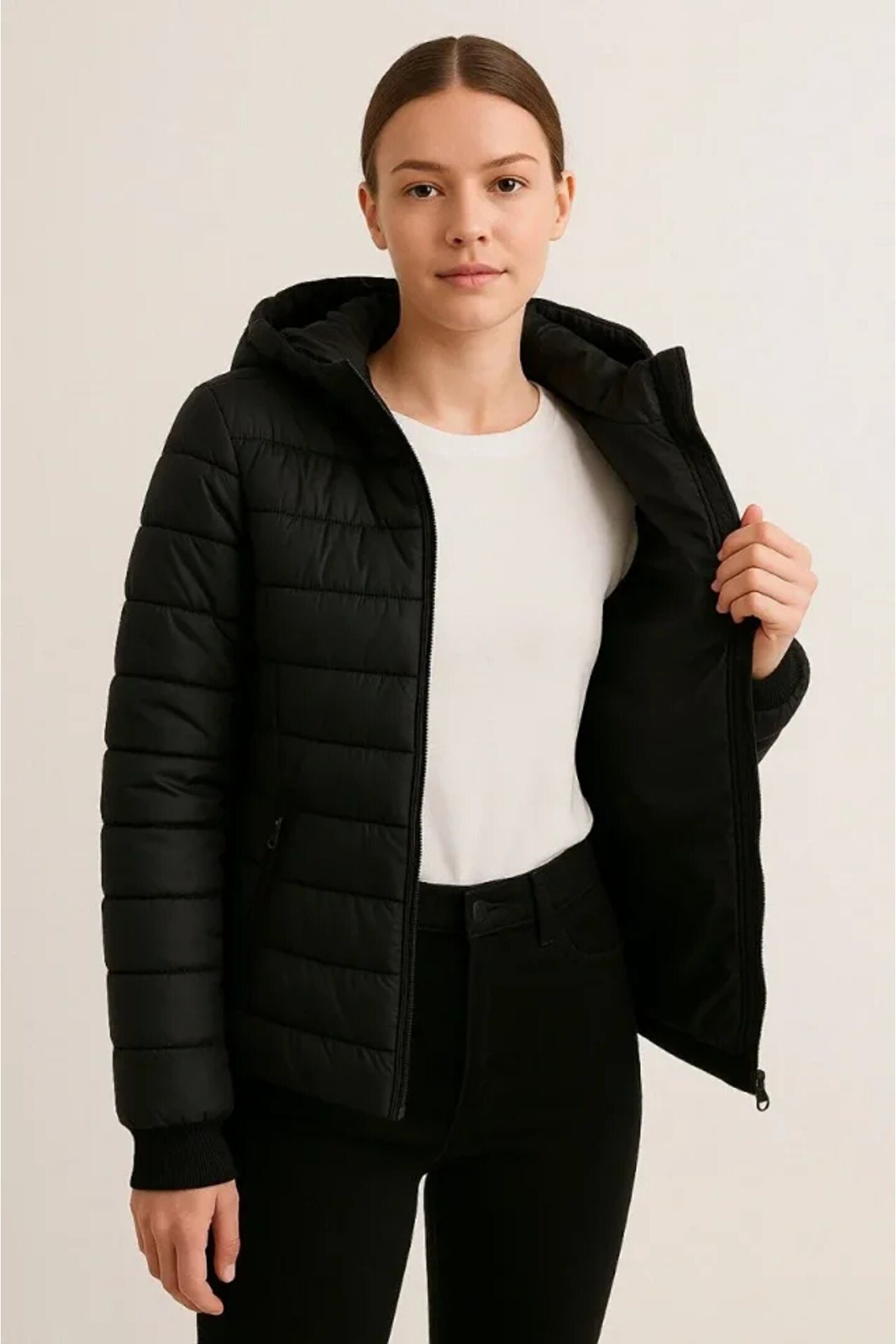Şişme Kapüşonlu Fermuarlı Mont Su Itici Kapitone Astarlı Kumaş Cepli Kışlık Rahat Kalıp - Siyah