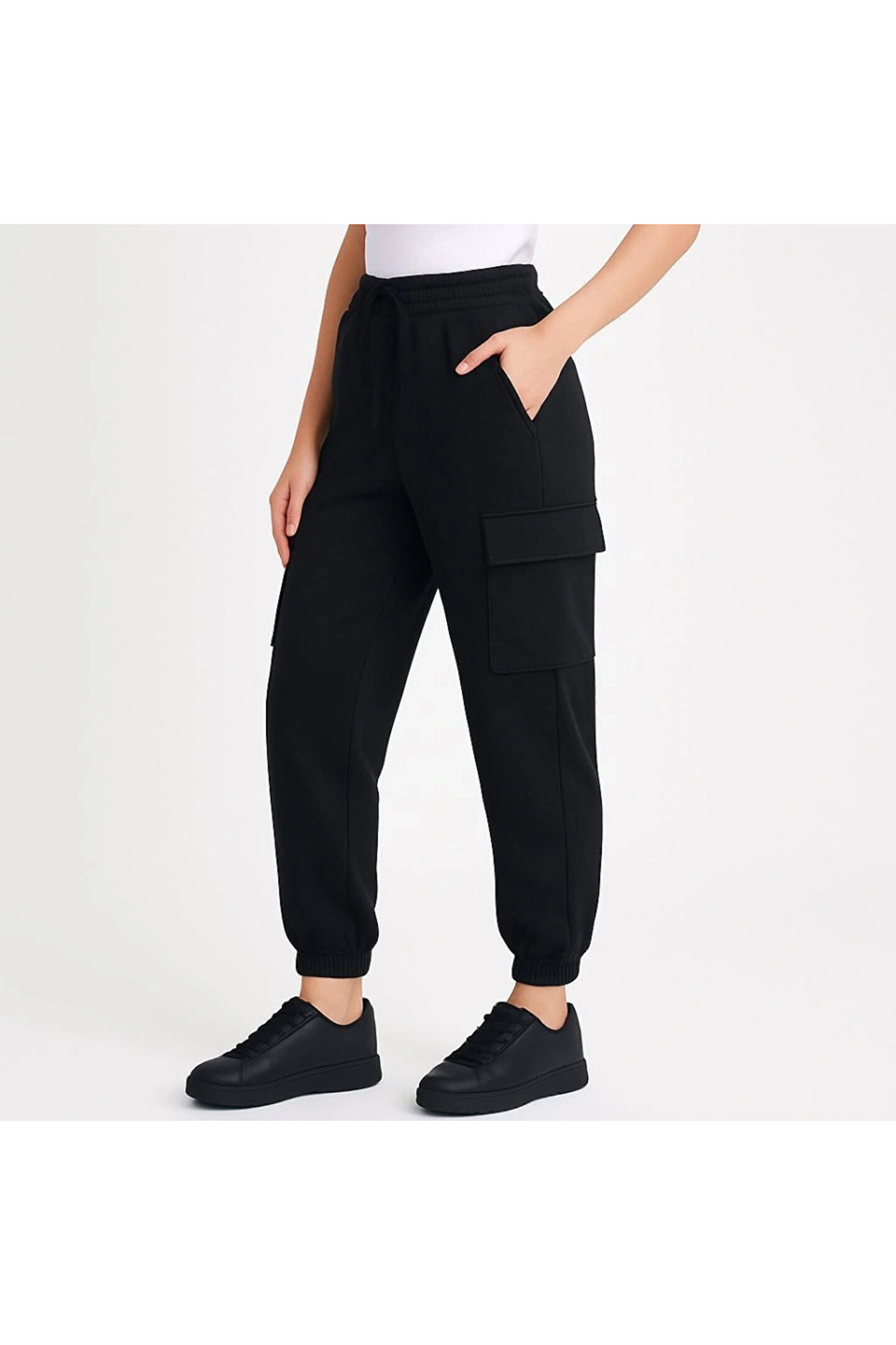 Siyah Jogger Eşofman Altı Rahat Kalıp, Kargo Cepli, Lastikli Paça, Günlük Spor Pantolon - Siyah