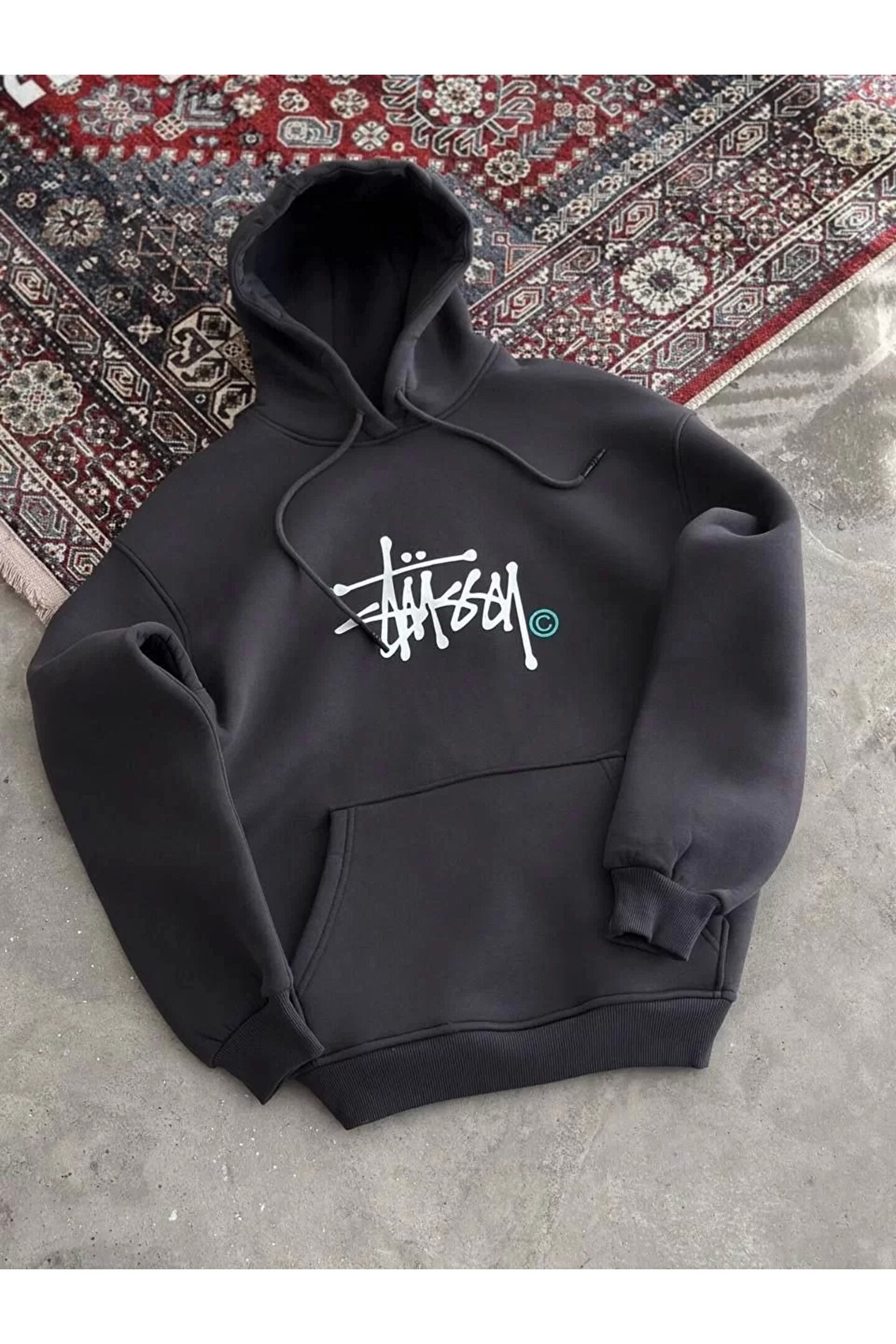 Üç İplik Kapşonlu Baskılı SweatShirt - Füme hediye paketi yapılabilir