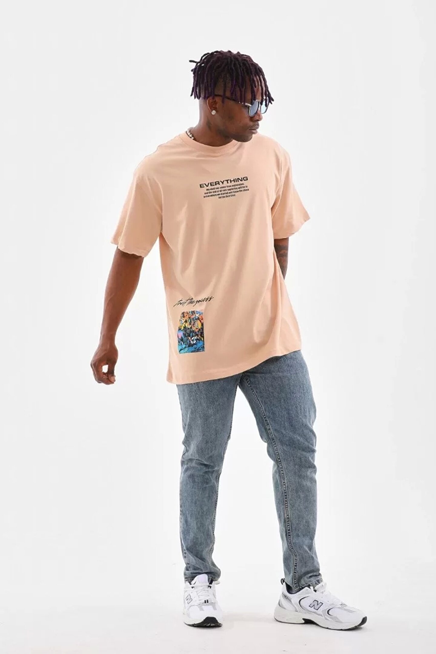 Silerra Unisex Bisiklet Yaka Baskılı Oversize T-Shirt - Bej