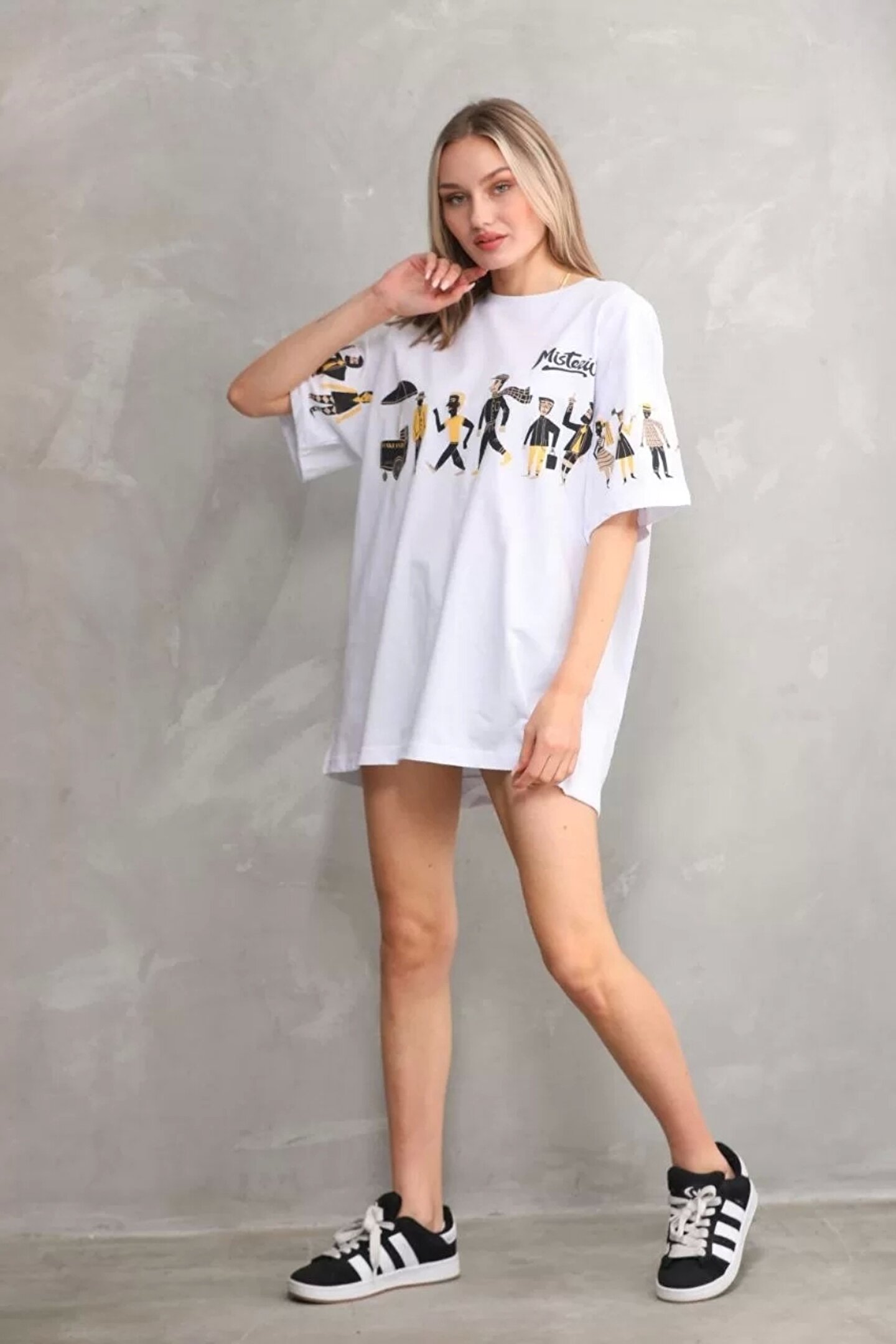 Silerra Unisex Bisiklet Yaka Baskılı Oversize T-Shirt - Beyaz