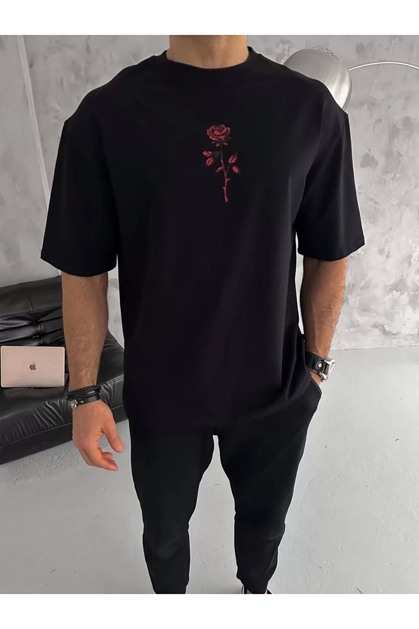 Unisex Bisiklet Yaka Baskılı Oversize T-Shirt - Siyah