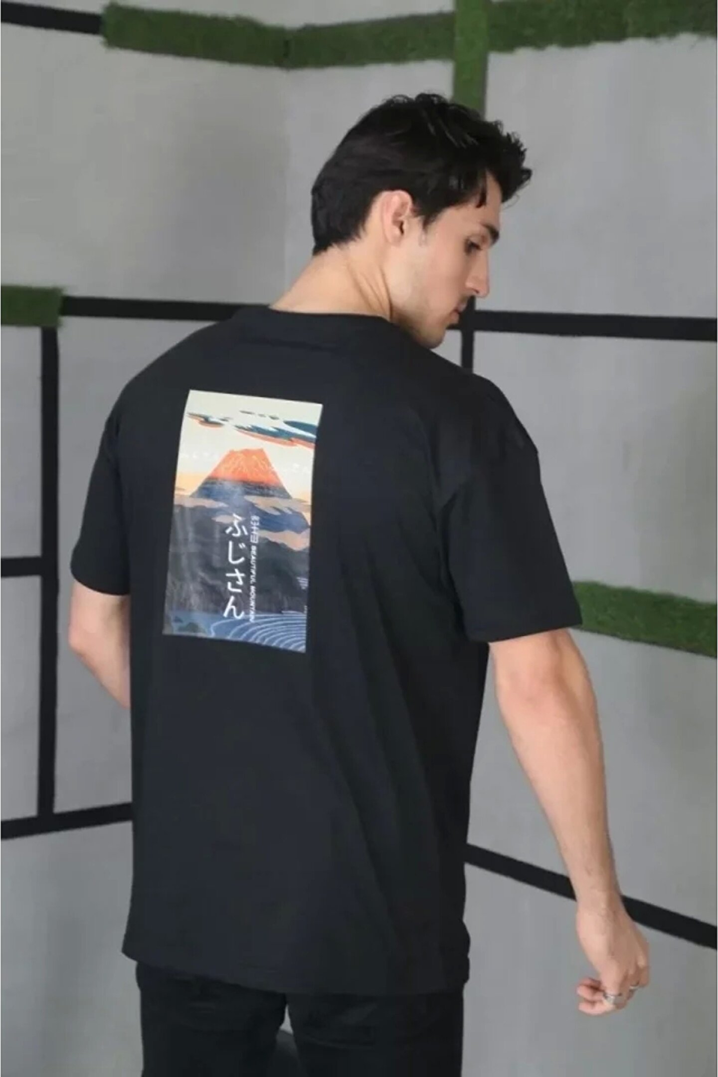 Unisex Bisiklet Yaka Baskılı Oversize T-Shirt - Siyah