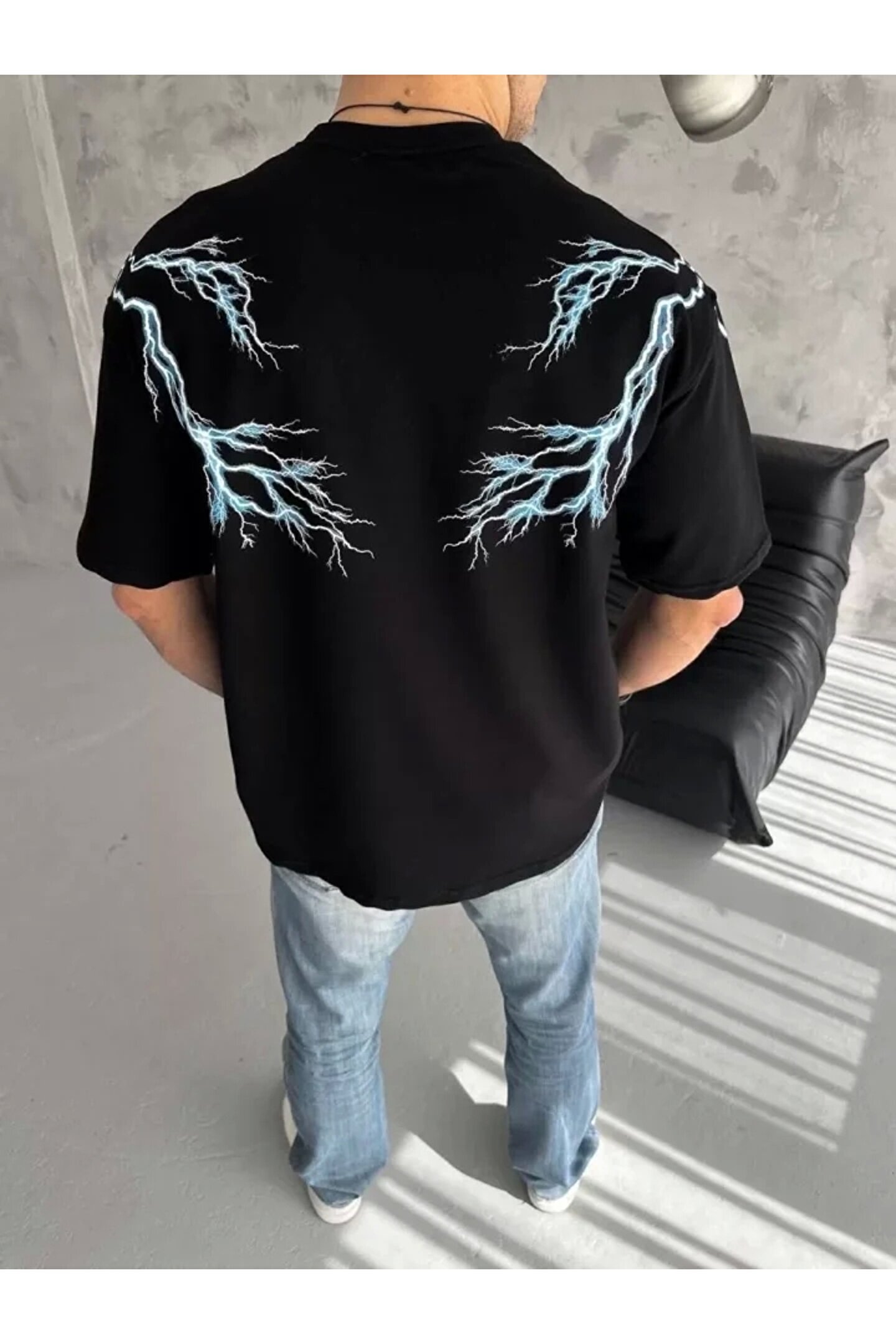 Unisex Bisiklet Yaka Baskılı Oversize T-Shirt - Siyah
