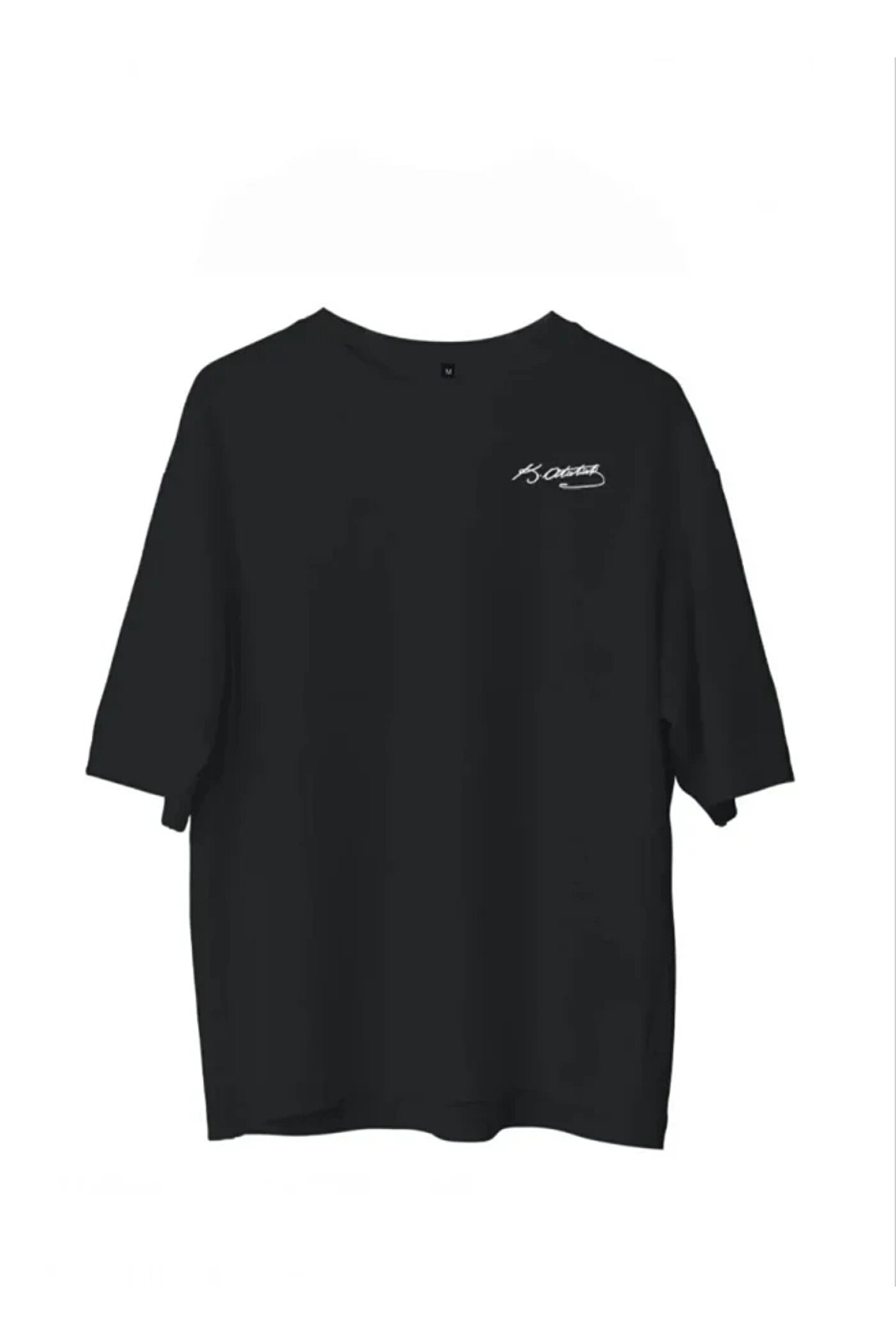 Unisex Bisiklet Yaka Baskılı Oversize T-Shirt - Siyah