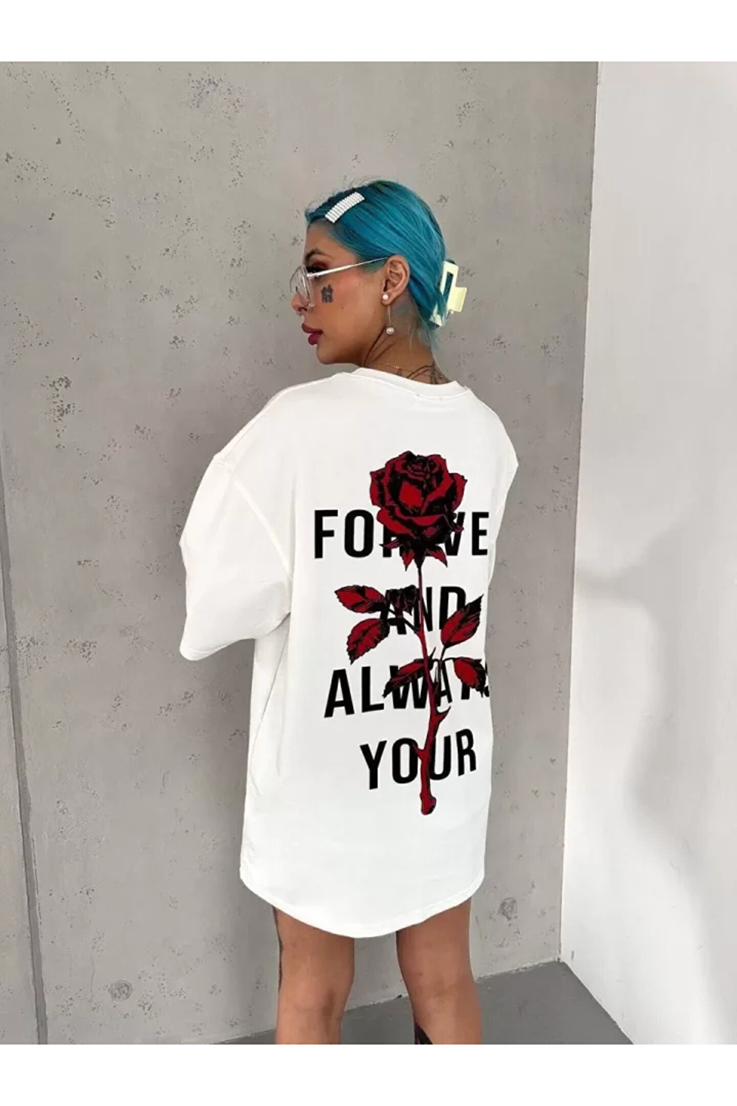 Unisex Bisiklet Yaka Baskılı Oversize T-Shirt - Beyaz