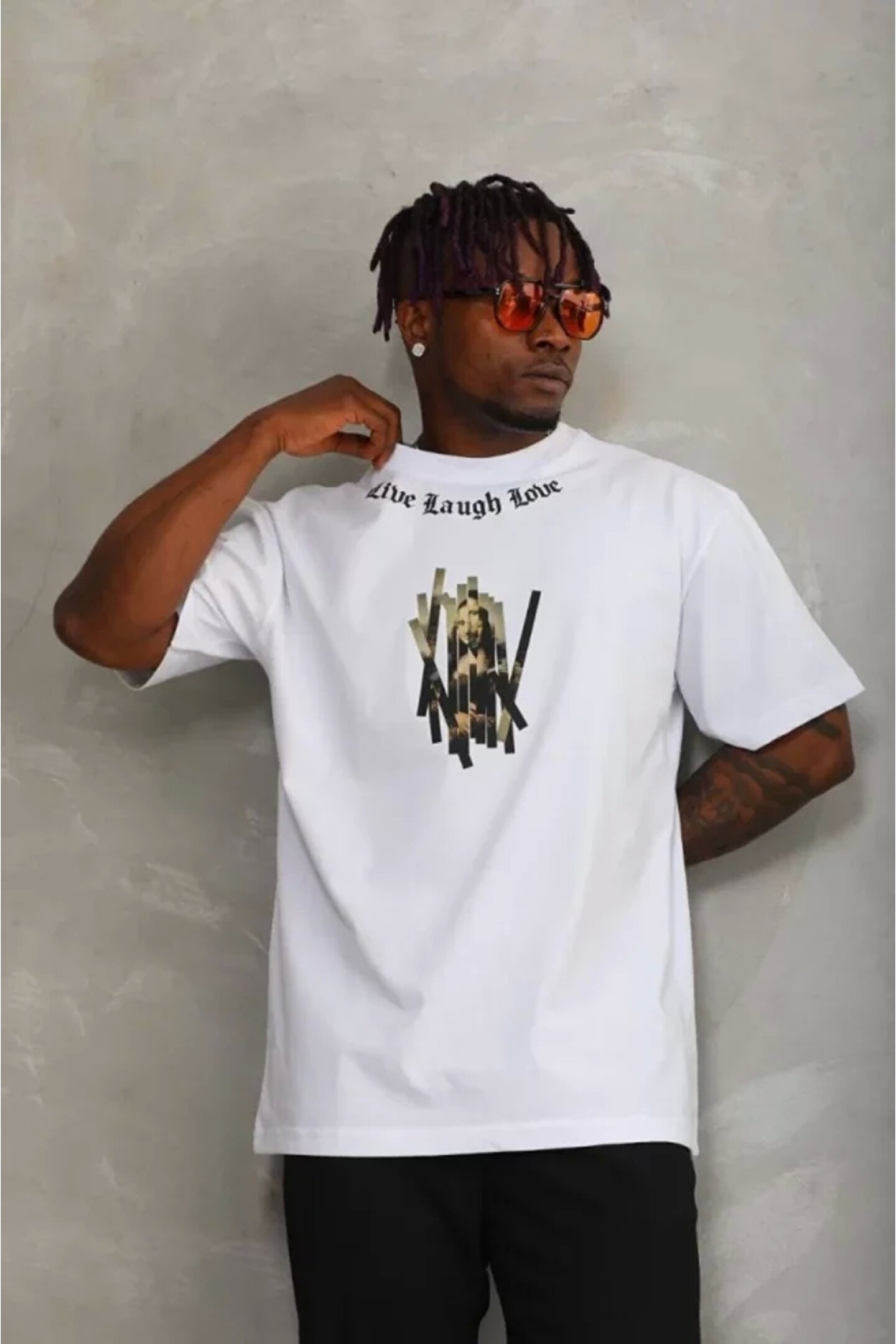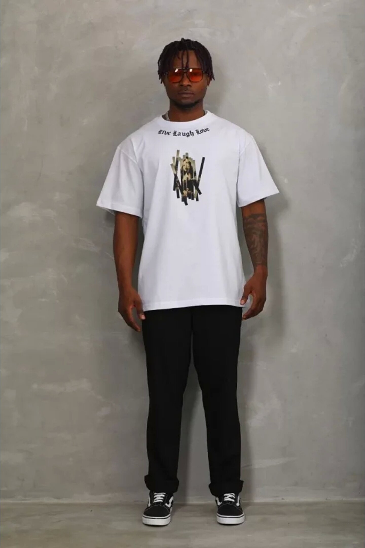 Unisex Oversize Baskılı Bisiklet Yaka T-Shirt - Beyaz