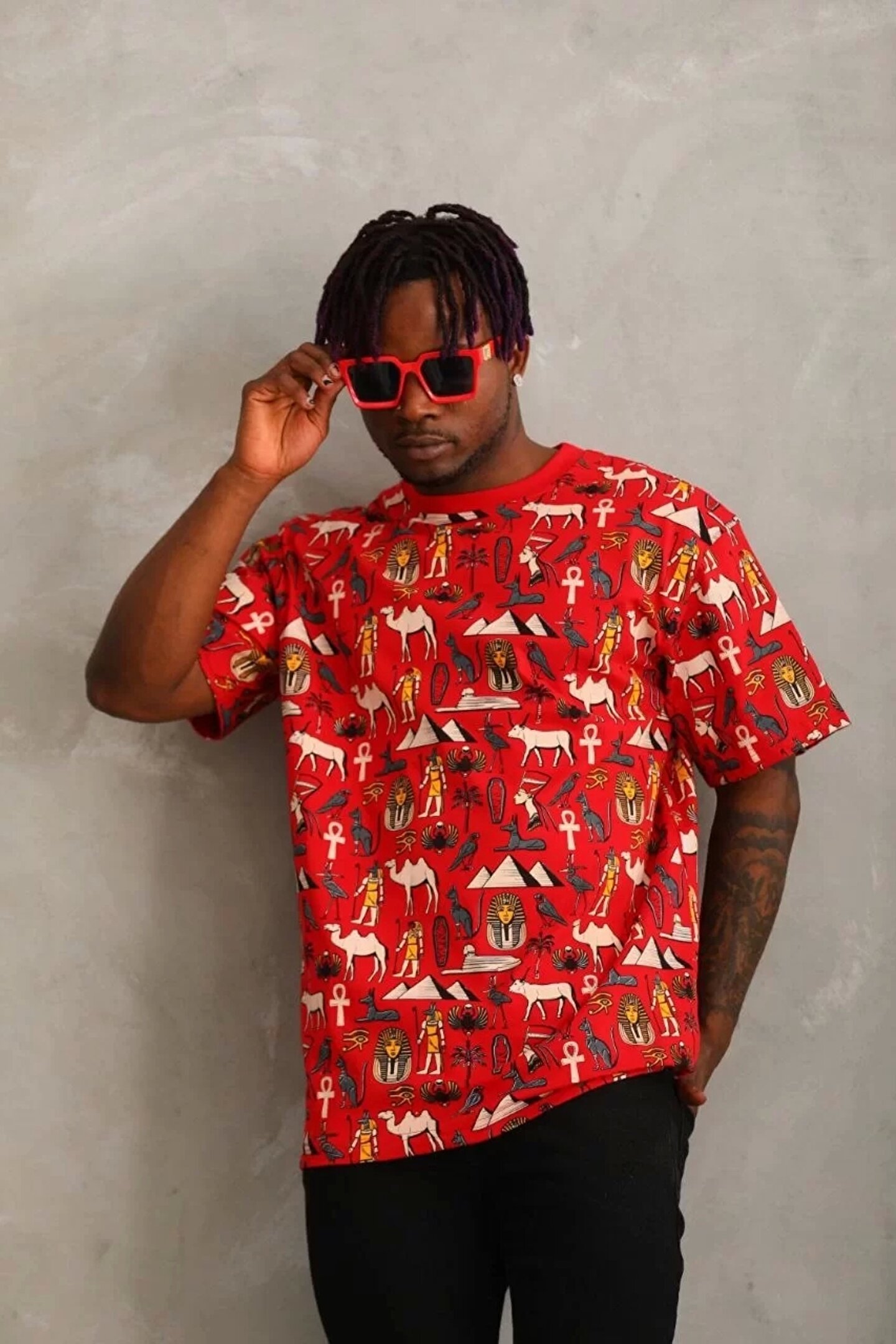 Unisex Oversize Baskılı Bisiklet Yaka T-Shirt - Kırmızı