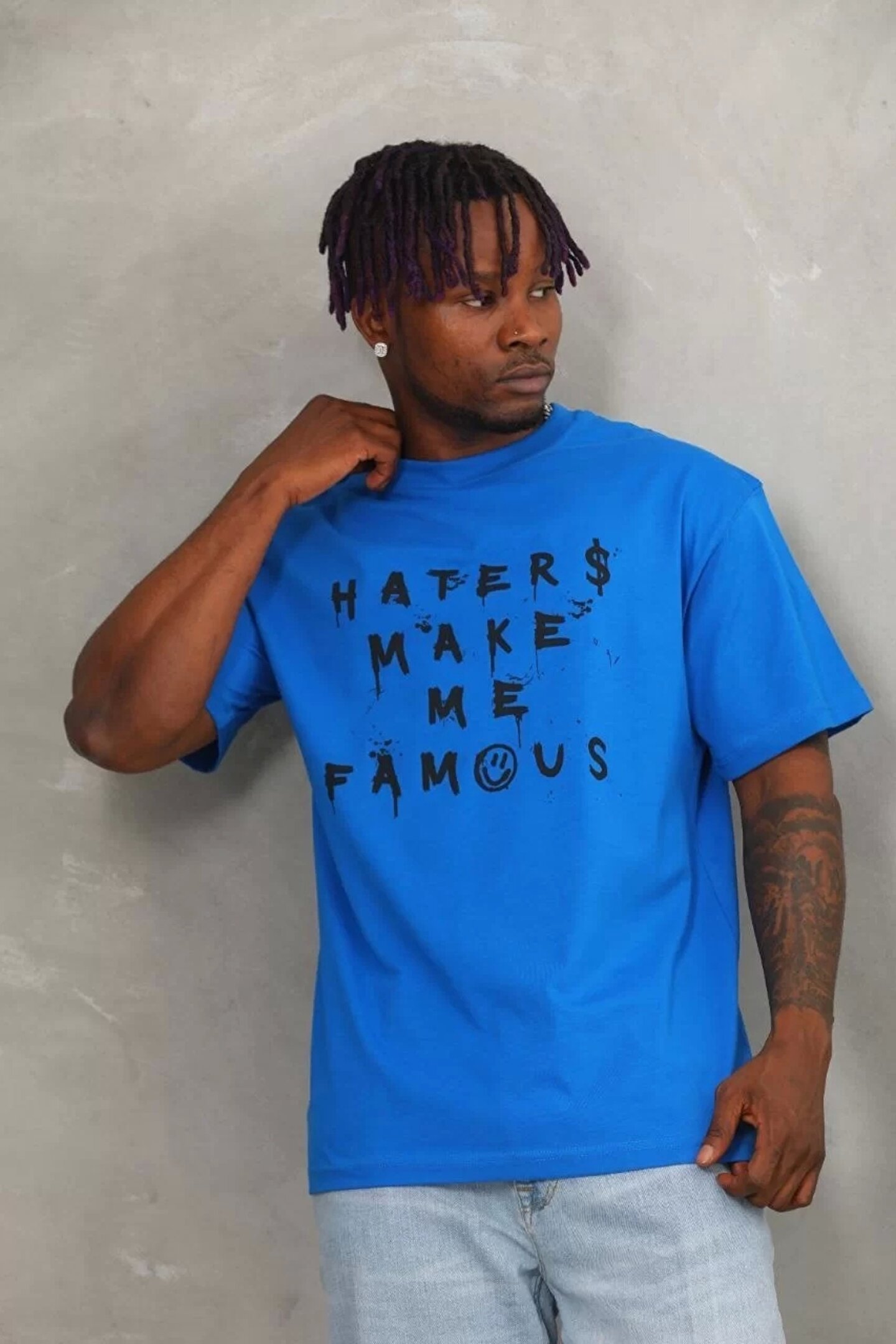 Unisex Oversize Baskılı Bisiklet Yaka T-Shirt - Mavi