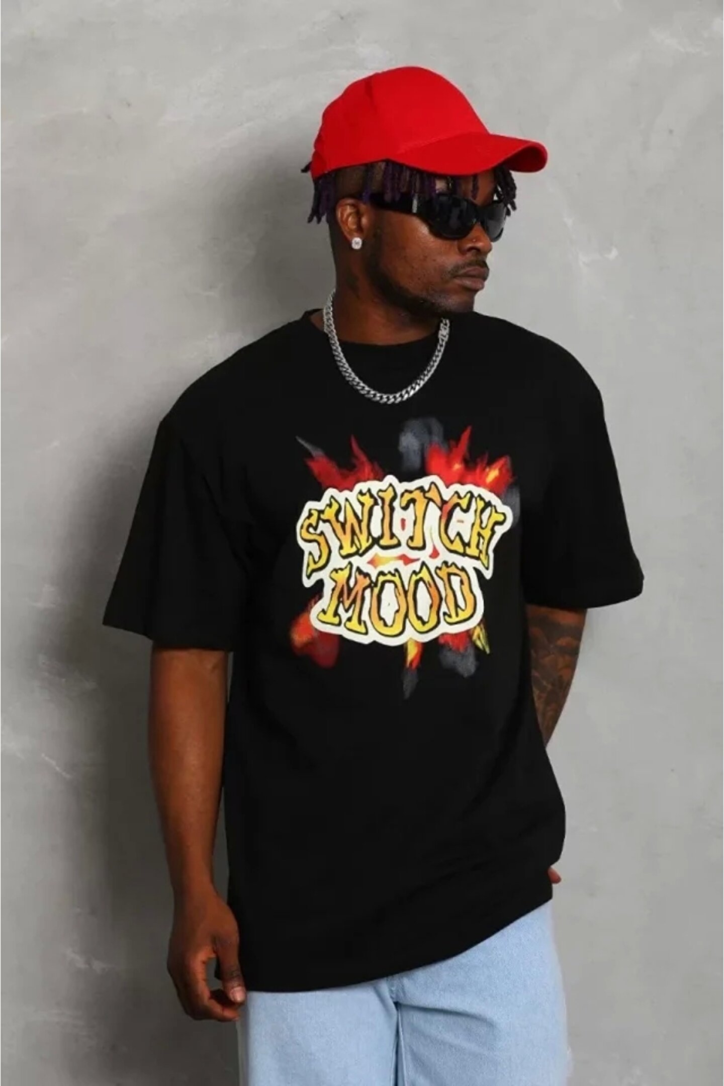 Unisex Oversize Baskılı Bisiklet Yaka T-Shirt - Siyah