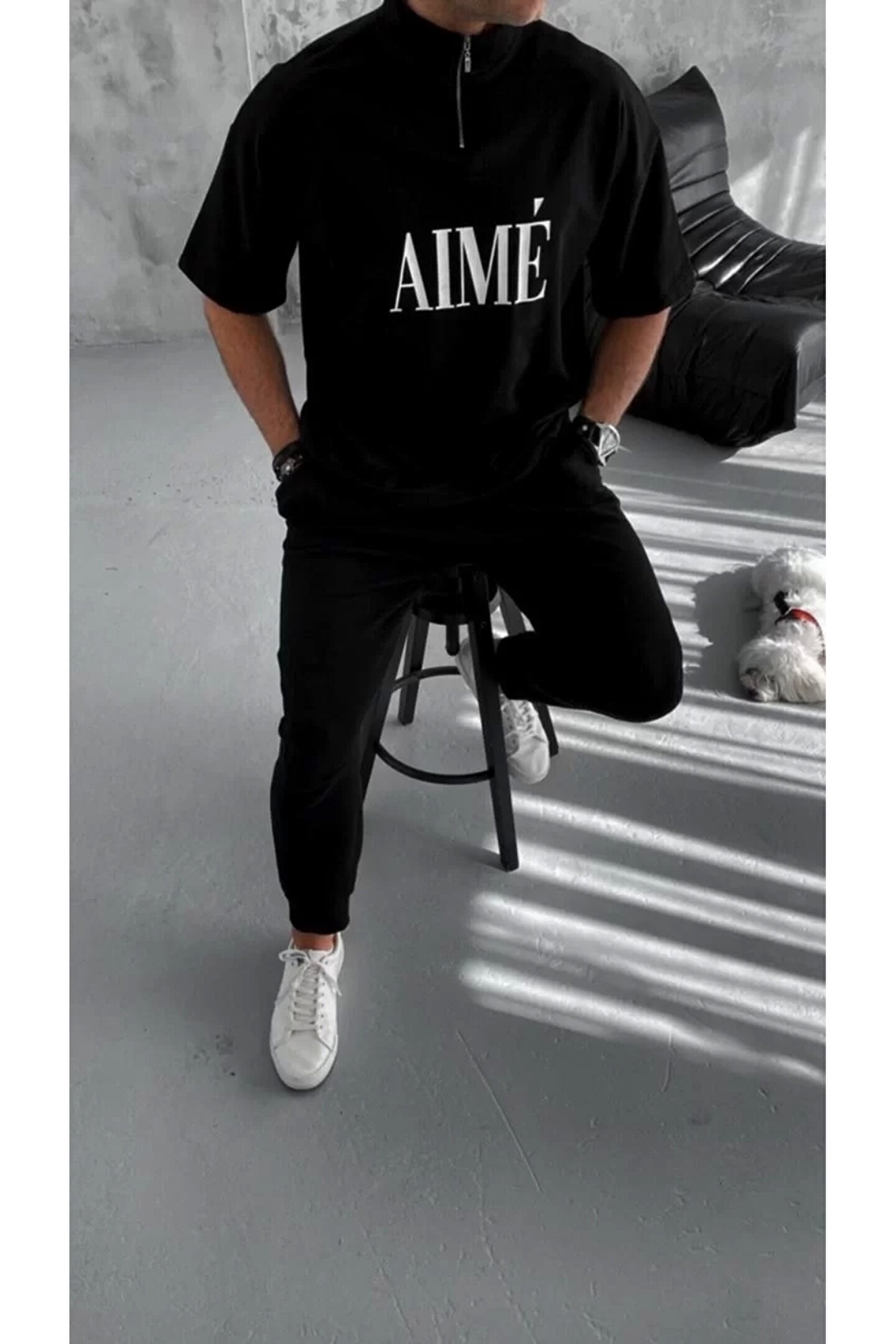 Unisex Yarım Fermuarlı Baskılı T-Shirt - Siyah
